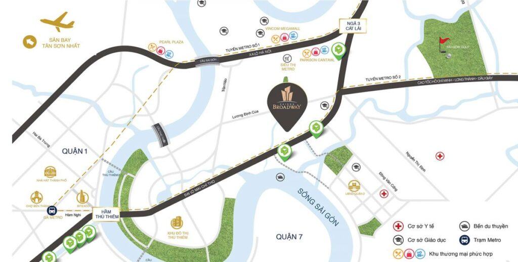 Sài Gòn Broadway tọa lạc ngay tại mặt tiền của tuyến đường Mai Chí Thọ huyết mạch của Tp. Thủ Đức giúp kết nối giữa quận 1; quận 4; quận 7; quận Bình Thạnh nhanh chóng trong một khoảng thời gian ngắn.