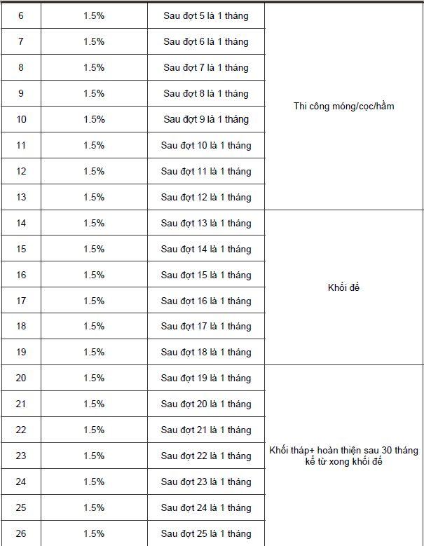 + Thanh toán 1.5%GTSP/tháng khi dự án Thi công móng/cọc/hầm trong thời gian 12 tháng