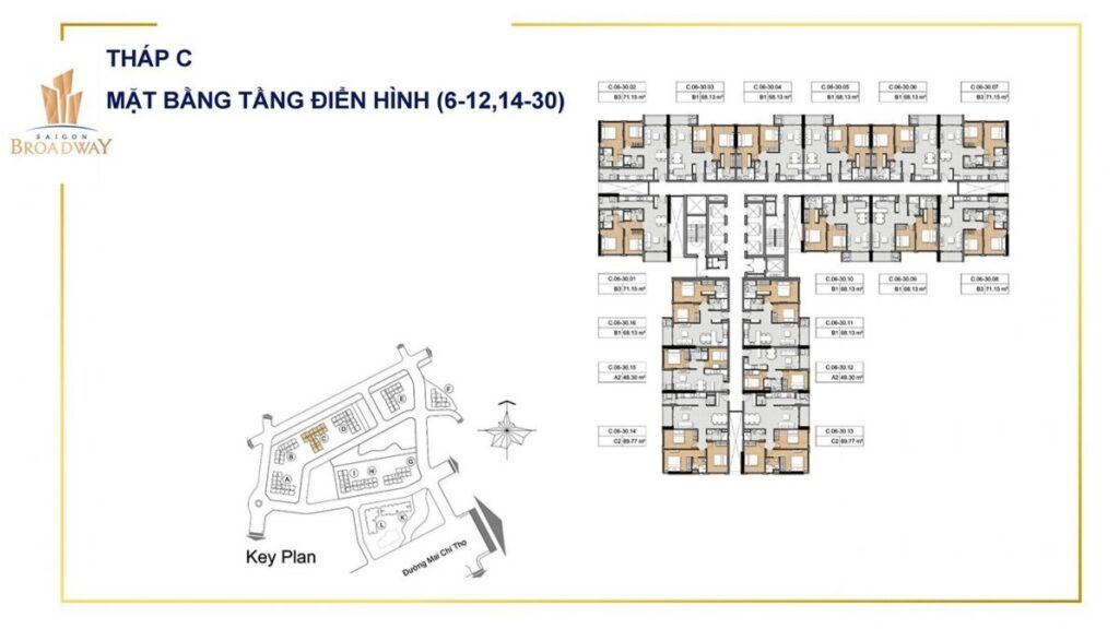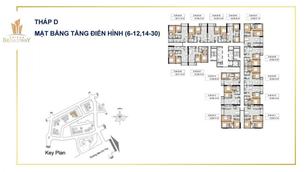 Mặt bằng tầng điển hình tháp C và Tháp D của dự án căn hộ Sài Gòn Broadway thiết kế 1 tầng gồm 14 căn hộ bao gồm :