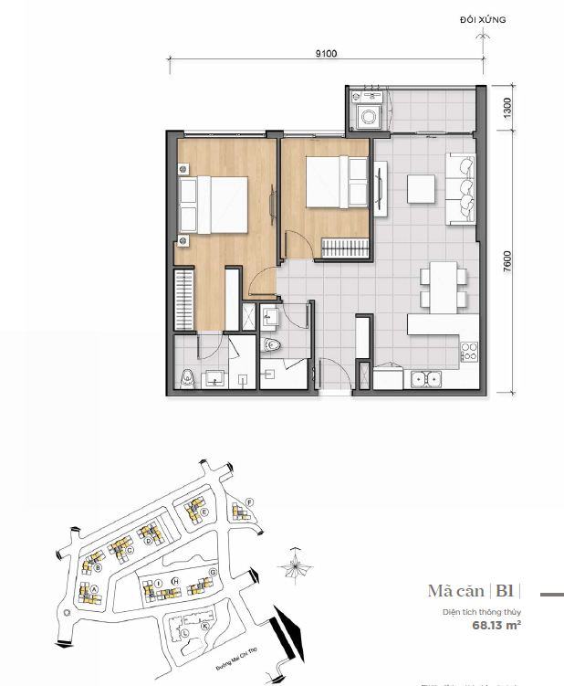 + Loại 2 phòng ngủ: diện tích 68,13m2 và 71,15m2