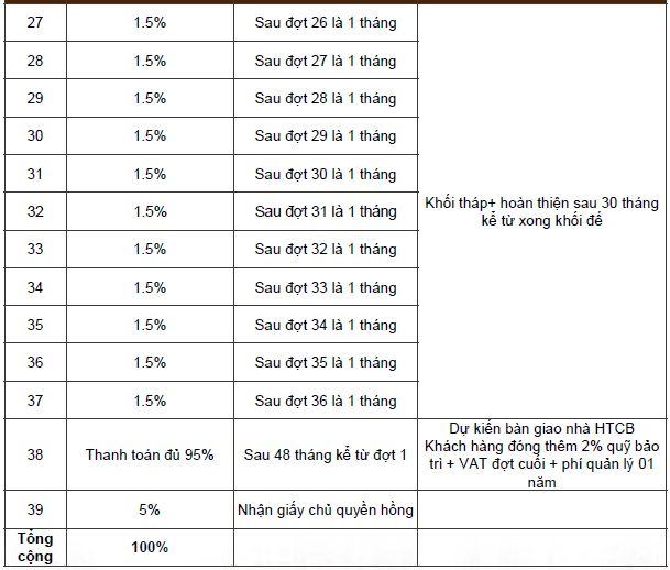 + Bàn giao nhà (dự kiến sau 48 tháng từ đợt 1): thanh toán đủ 95%GTSP + 2% chi phí bảo trì + phí quản lý 1 năm