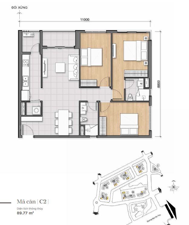 +Loại 3 phòng ngủ: diện tích 89,77m2