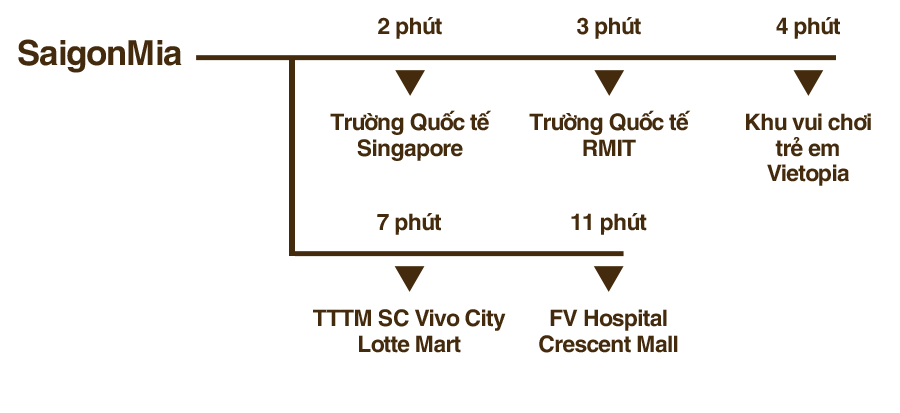 Từ Saigon Mia, cư dân chỉ mất khoảng 5 phút để vào trung tâm Quận 1 và Khu đô thị Phú Mỹ Hưng, đồng thời dễ dàng tận hưởng những tiện ích hàng đầu chỉ trong bán kính 2km.