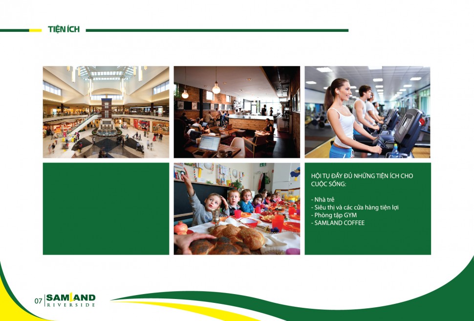 Samland Riverside đã được chủ đầu tư thiết kế và trang bị hàng loạt tiện ích dịch vụ cao cấp, cần thiết cho cuộc sống của mọi cư dân ngay tại nội khu như: hồ bơi hiện đại; công viên cây xanh; trung tâm thương mại; spa chăm sóc khách hàng; phòng tập gym; trung tâm TDTT; khu sinh hoạt cộng đồng; khu vui chơi dành cho trẻ em; nhà trẻ; mẫu giáo…