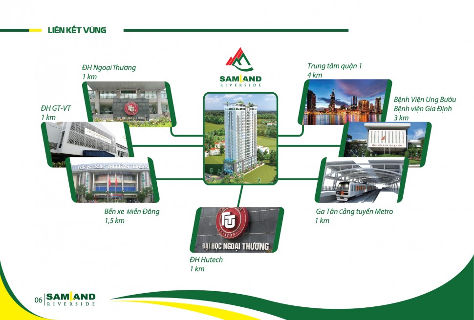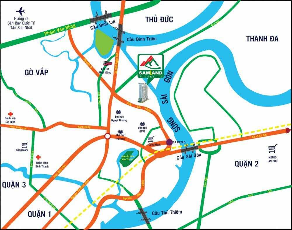 Nhờ vị trí tọa lạc, cư dân của khu căn hộ Samland Riverside sẽ dễ dàng kết nối thuận tiện tới khu vực các quận trung tâm chỉ trong vòng vài phút bằng xe máy đi lại, gia tăng khả năng kết nối với tuyến đường Phạm Văn Đồng và ngoài ra còn di chuyển nhanh chóng, thuận tiện tới các tiện ích dịch vụ hiện hữu như: sân bay Tân Sơn Nhất; cách ga Tân Cảng; tuyến Metro Bến Thành – Suối Tiên… trong phạm vi chỉ 2km.