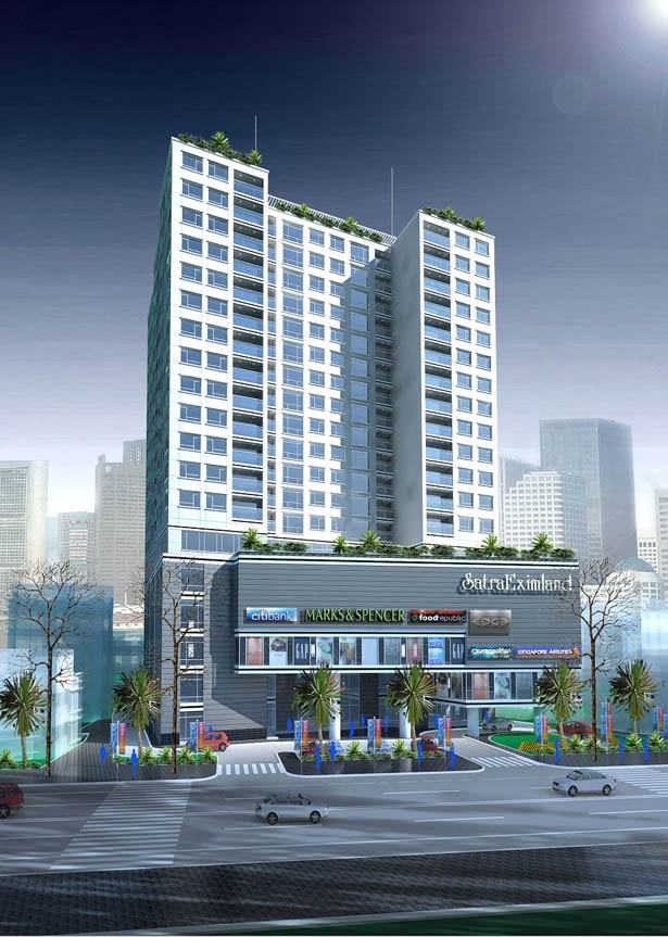 Cao ốc Satra Eximland cao 72m với 2 tầng hầm và 18 tầng cao, trong đó bố trí 5 tầng thương mại và 13 tầng căn hộ: