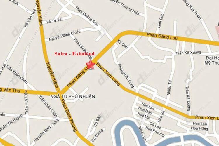 Cao ốc Satra Eximland tọa lạc tại số 163 Phan Đăng Lưu, Phường 1, Quận Phú Nhuận, gần Ngã tư Phú Nhuận và đường Phan Xích Long. Đây là một vị trí đắc địa do nằm trên trục đường thương mại – dịch vụ chính của Quận Phú Nhuận, là trung tâm kết nối giao thông và thương mại giữa các Quận 1, Quận 3, Quận Bình Thạnh, Quận Tân Bình, Quận Gò Vấp và chỉ cách sân bay quốc tế Tân Sơn Nhất khoảng 1,5km.