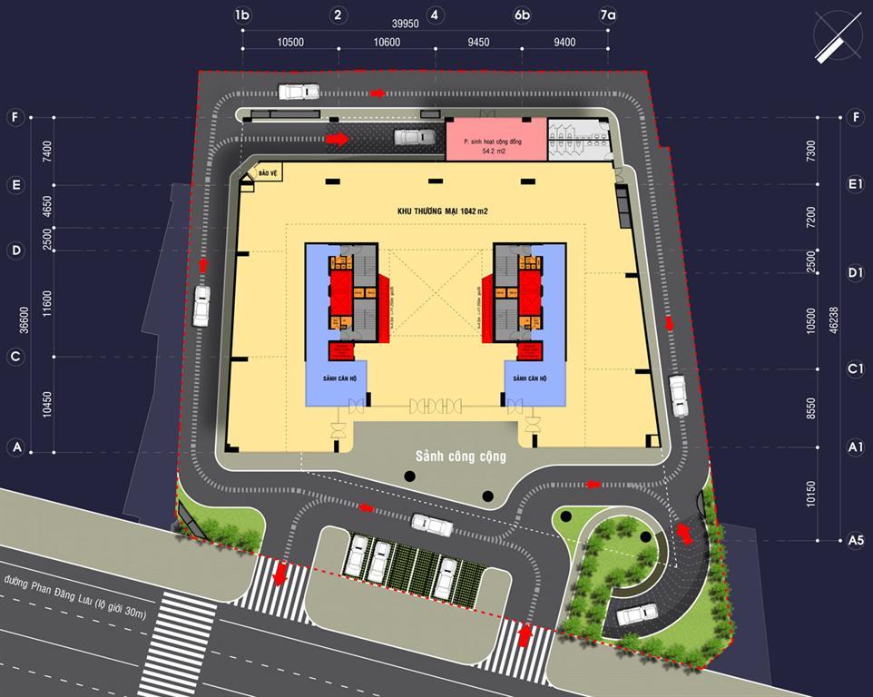 – Khối đế với quy mô gồm 5 tầng và 1 tầng lững, là trung tâm thương mại – dịch vụ với tổng diện tích sàn xây dựng khoảng 9.550 m2. Sảnh chính của khu thương mại được thiết kế có không gian thoáng đãng, sang trọng. Tại khu thương mại này có 2 thang máy và 8 thang cuốn, sẵn sàng đáp ứng mọi nhu cầu đi lại phục vụ cho việc tham quan, mua sắm của cư dân trên địa bàn và các quận lân cận.
