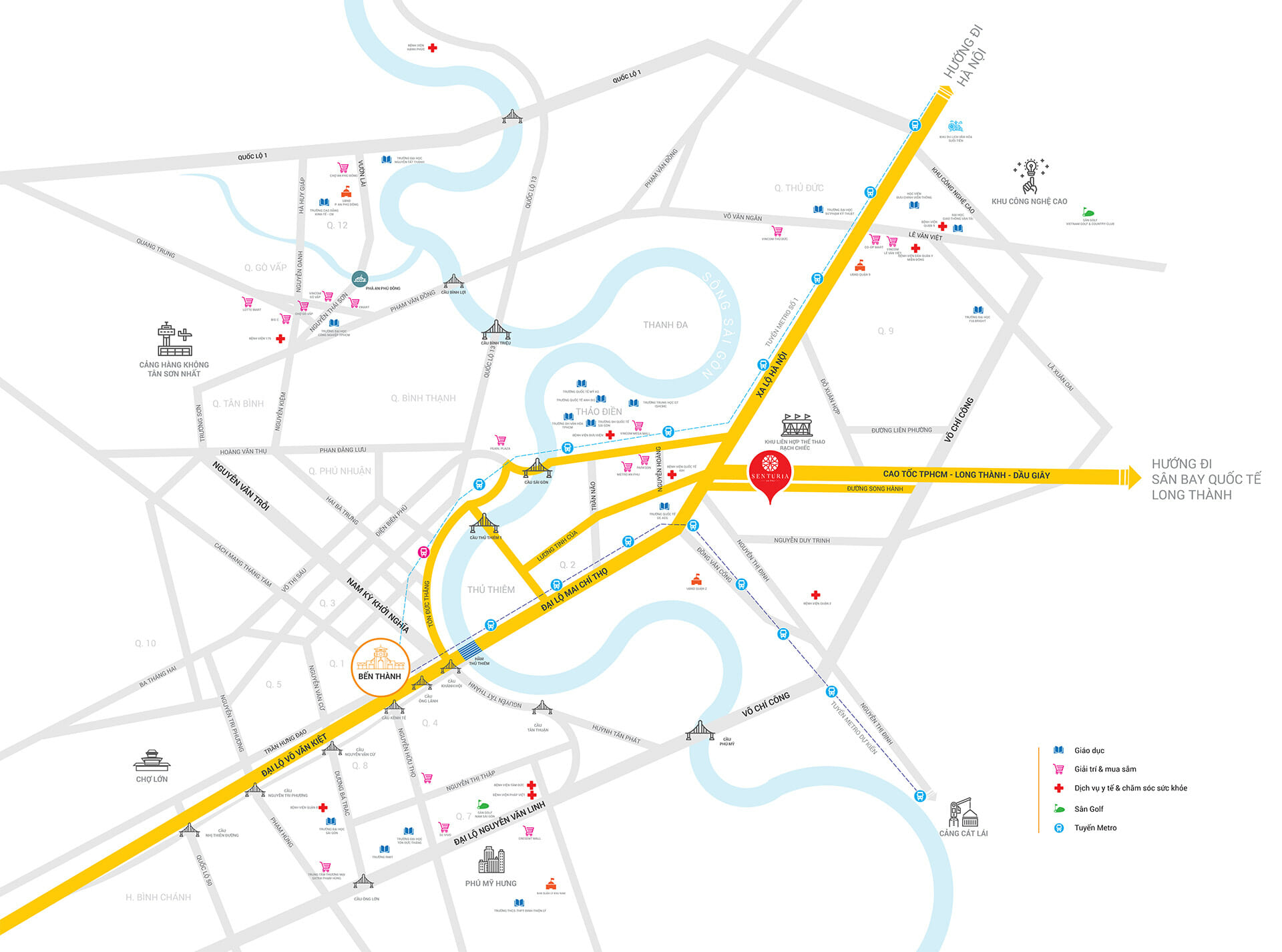 Chỉ 3 – 5 phút: Di chuyển đến Khu đô thị mới Thủ Thiêm (trung tâm tài chính mới của TP.HCM), Khu dân cư cao cấp Thảo Điền, hệ thống trung tâm thương mại (Estella Place, Vincom Mega Mall, Mega Market An Phú) và các trường quốc tế hàng đầu (Úc, Mỹ, Anh).