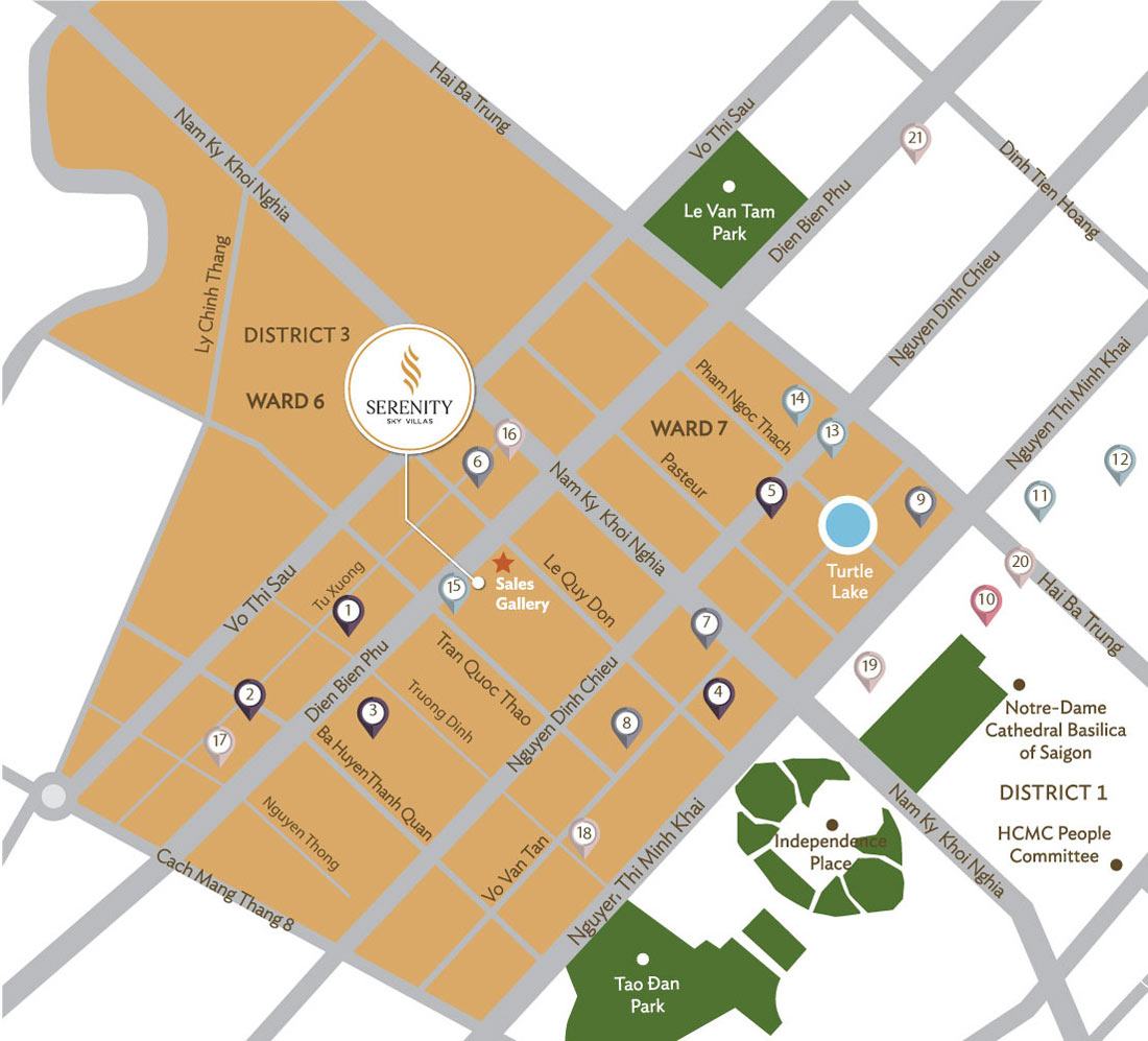 Với sự xuất hiện dày đặc của nhiều dự án bất động sản tại quận 3, Serenity Sky Villas là cái tên hiếm hoi có thể nằm tại một vị trí tốt ở trung tâm và kết nối đến những khu vực khác. Từ vị trí này, bạn không chỉ dễ dàng tới các cơ quan chức năng địa phương, đại sứ quán Nhật Bản mà thậm chí ngay cả những quận huyện khác trong thành phố cũng rất dễ dàng. Đặc biệt, vì nằm ở ngã tư Điện Biên Phủ nên cạn chỉ cách quận 1 chưa tới 1 cây số.