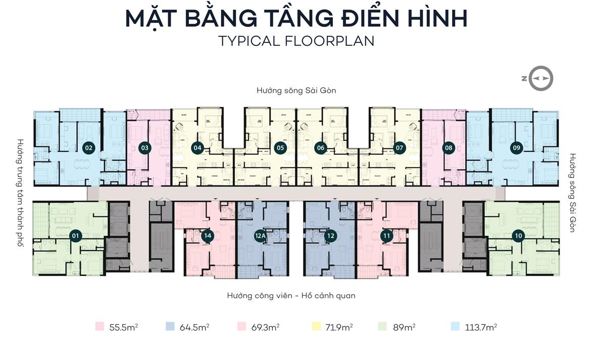 Mặt bằng chi tiết căn hộ Sky 89 gồm 15 căn hộ, 6 thang máy và 2 thang thoát hiểm. Dãy căn hộ vị trí số 02 đến 09 view hướng Đông trực diện sông Sài Gòn và cửa chính hướng Tây. Dãy căn hộ 01, 10-14 view hướng Tây Phú Mỹ Hưng và hồ cảnh quang nội khu, cửa hướng Đông.