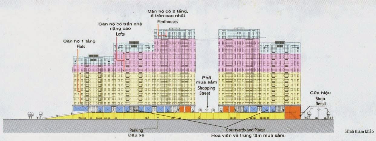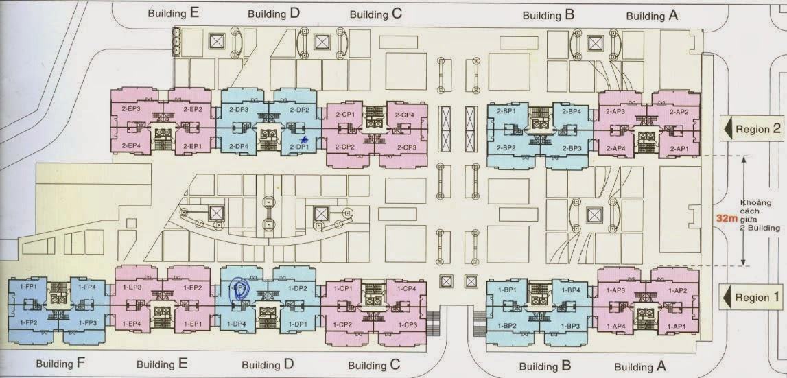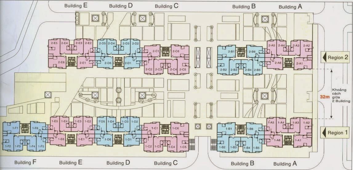 Khoảng cách giữa hai dãy nhà rộng từ 32 đến 36 m, mỗi block được bố trí lệch nhau nhằm tăng diện tích mặt thoáng tiếp xúc không gian và đối lưu không khí.