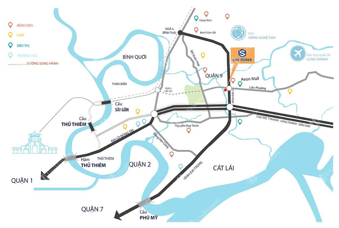 Căn hộ Sun Tower tọa lạc ngay trên khu đất góc đường Vành Đai Trong và đường Liên Phường – Phú Hữu quận 9. Hiện tại, đây là một trong những khu vực có tiềm năng phát triển mạnh mẽ nhất trong khu vực quận 9 với sự xuất hiện của khu Công Nghệ Cao quận 9.