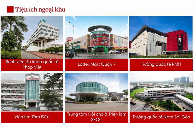 Ngoài các tiện ích dịch vụ ngay nội khu như đã được kể trên thì dự án còn được hưởng lợi nhờ vị trí tọa lạc trong phạm vi 3km với các tiện ích hiện hữu như: trung tâm hành chính; bệnh viện; chuỗi nhà hàng; ngân hàng; trung tâm thương mại; Trung tâm Hội chợ  & triển lãm Sài Gòn SECC;…