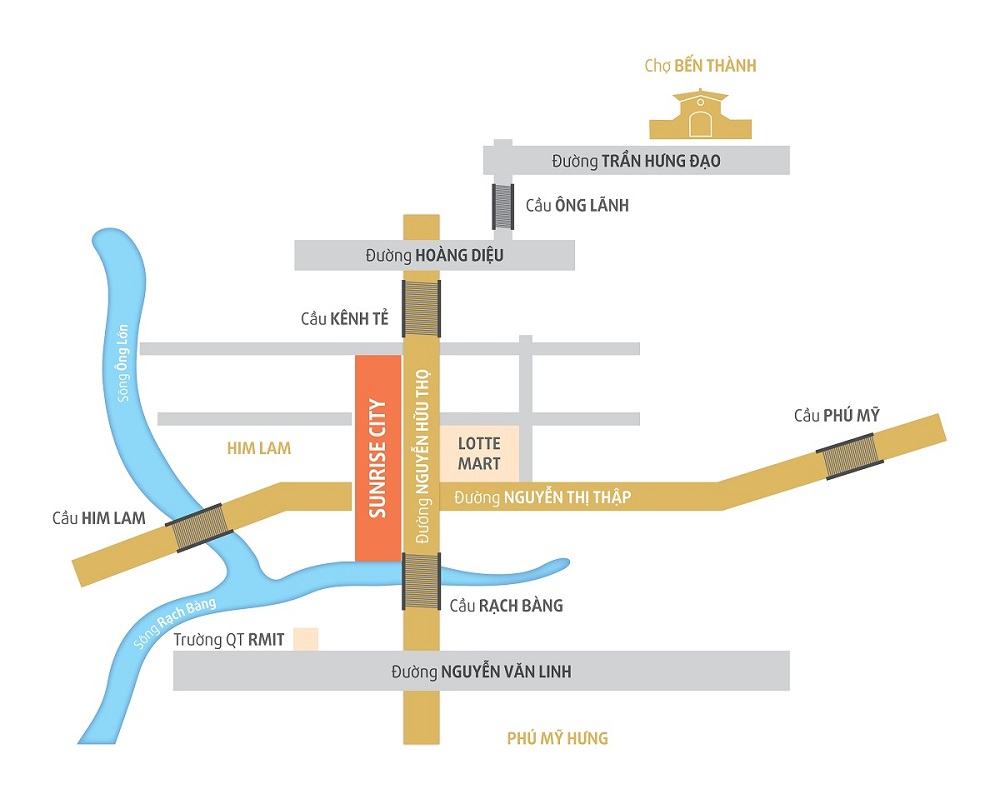 Dự án Sunrise City được triển khai tại mặt tiền đường Nguyễn Hữu Thọ – vị trí tọa lạc đắc địa, kết nối giao thông giữa hai khu vực trung tâm thành phố hiện hữu – KĐT Phú Mỹ Hưng. Nhờ thế mà khả năng liên kết vùng của dự án sẽ nhanh chóng tới các khu vực lân cận như: quận 1; quận 5; quận 8; quận 7; huyện Nhà Bè; Cần Giờ… bằng hàng loạt tuyến đường huyết mạch trong khu vực.