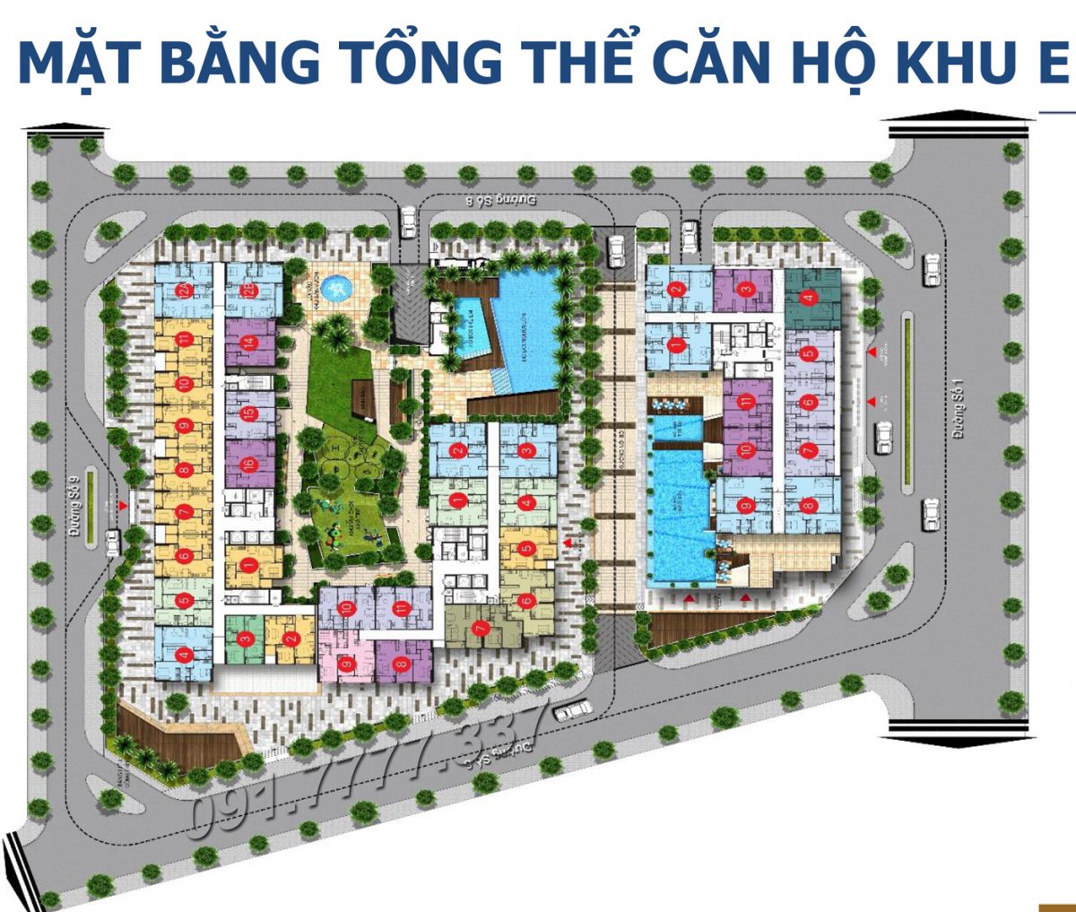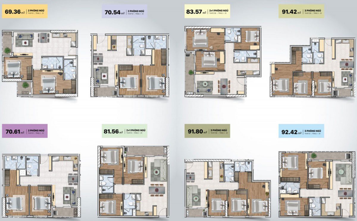 + Khu E bao gồm 3 tòa tháp E1A – E1B – E2, mặt bằng có cả hồ bơi nội khu với độ cao 21 tầng, diện tích 10.746 m2.
