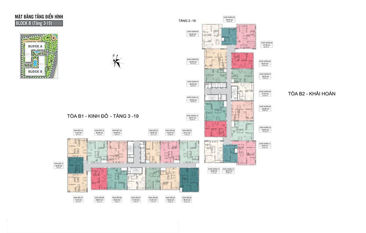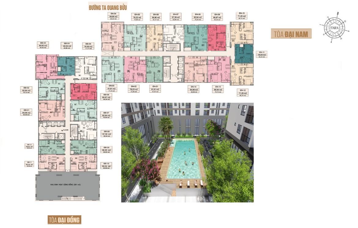 Toàn dự án Căn Hộ Tara Residence được chia làm 4 khối: Khối Đại Nam(ĐN), Khối Đại Đồng(ĐĐ), Khối Kinh Đô(KĐ), Khối Khải Hoàn(KH). Các khối được sắp xếp thành 2 hình chữ ” L” quay mặt vào nhau. Với thiết kế như vậy, một giếng trời khổng lồ được tạo ra ở chính giữa giúp cho không khí luôn được lưu thông. Ánh sáng luôn luôn tràn ngập trong căn hộ của quý khách. Tại block A sẽ có 471 căn diện tích từ 50 – 70m2, block B có 518 căn diện tích từ 75 – 100m2.