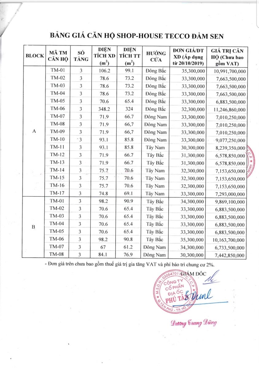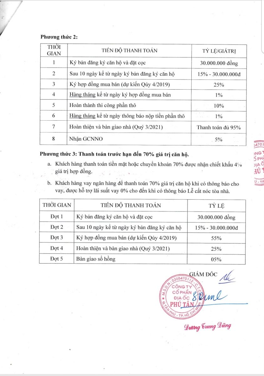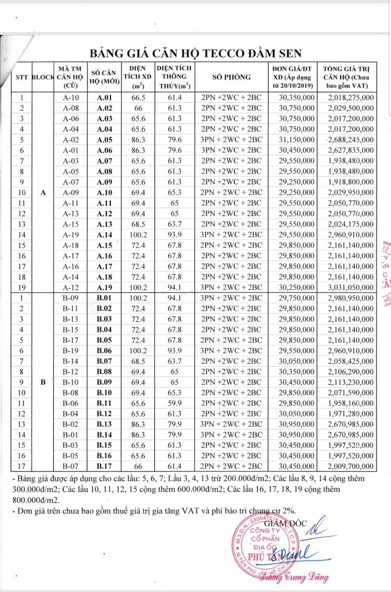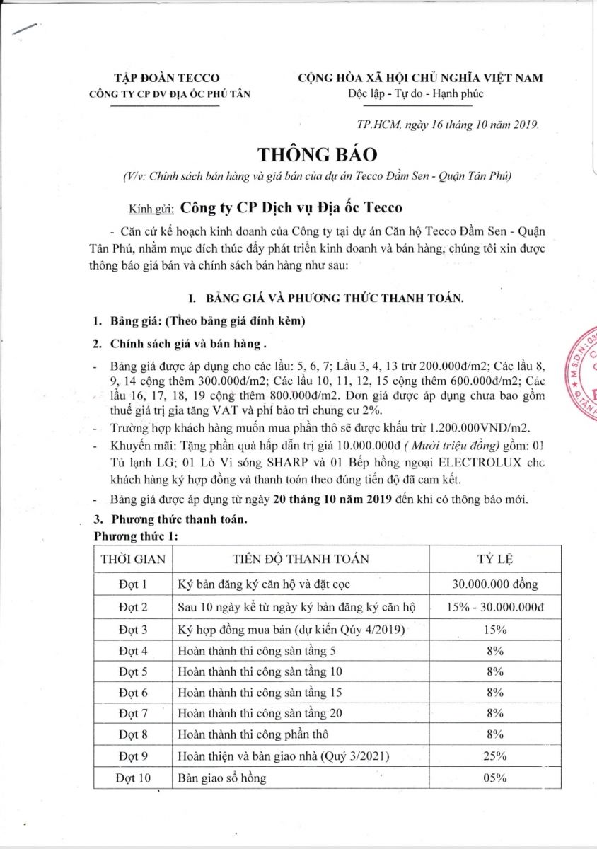Bảng giá và phương thức thanh toán Tecco Đầm Sen Complex từ chủ đầu tư: