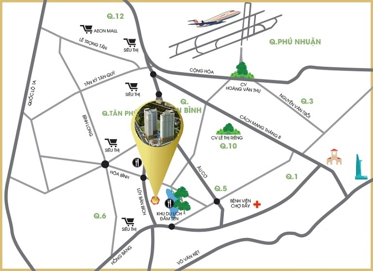 Dự án nằm ngay trung tâm của quận Tân Phú có tứ cận như sau: