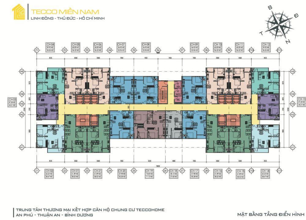 Dự án Tecco Home cao 22 tầng nổi và 2 tầng hầm để xe với tổng số 420 căn hộ, có quy mô từ 40,13 m2 – 75,83 m2 với sắp xếp bố trí 1 – 3 phòng ngủ, dự án chung cư Tecco Home là biểu tượng của sự vươn mình giữa hai thành phố Dĩ An và Thuận An