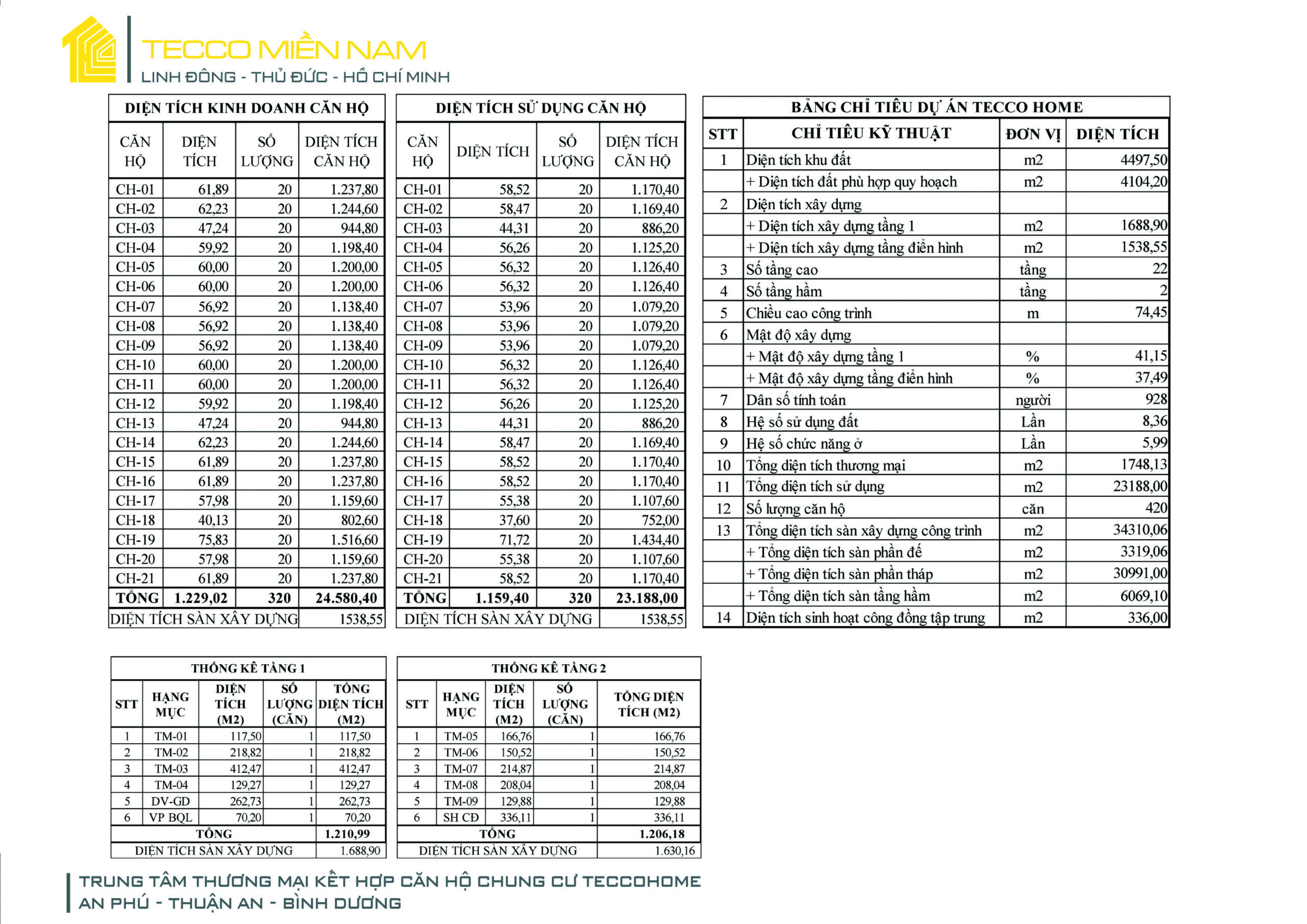 Tecco Home An Phú nằm trên tổng diện tích đất 4.497.5 m2; diện tích xây dựng chiếm 2.000 m2; mật độ xây dựng khoảng 41,15%; tổng diện tích sàn xây dựng là 50.000 m2.