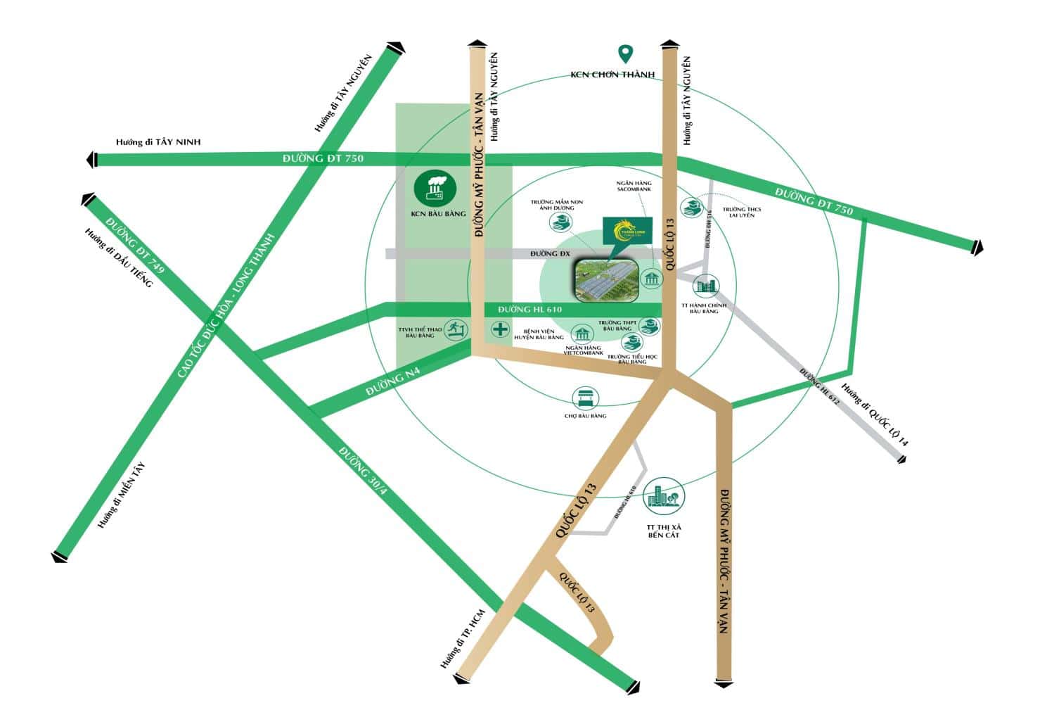 Thăng Long Central City nằm ngay trung tâm đô thị – công nghiệp Bàu Bàng 3200 Ha. – Huyện Bàu Bàng, là trung tâm đô thị phía bắc của Tỉnh Bình Dương. Vị trí tiếp giáp quốc lộ 13 – trục giao thương huyết mạch kết nối tam giác vàng gồm Tp. HCM, Bình Dương và Bình Phước, phía Tây dự án tiếp giáp với đường nội đô Trần Văn Thố thông ra đường Hồ Chí Minh, tuyến đường đi qua 28 tỉnh thành phố với tổng chiều dài 2.183km.