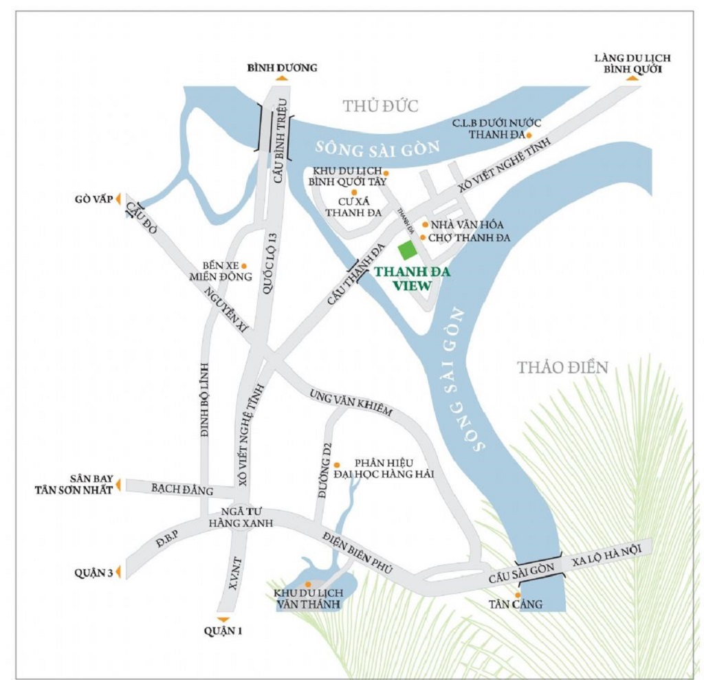 Thanh Đa View có vị trí triển khai xây dựng tại số 50 đường Thanh Đa – P. 27 – Q. Bình Thạnh – Tp Hồ Chí Minh. Nơi đây có lợi thế khi liền kề với quận 1, sở hữu 3 mặt được bao bọc bởi con sông Sài Gòn; kênh Thanh Đa.