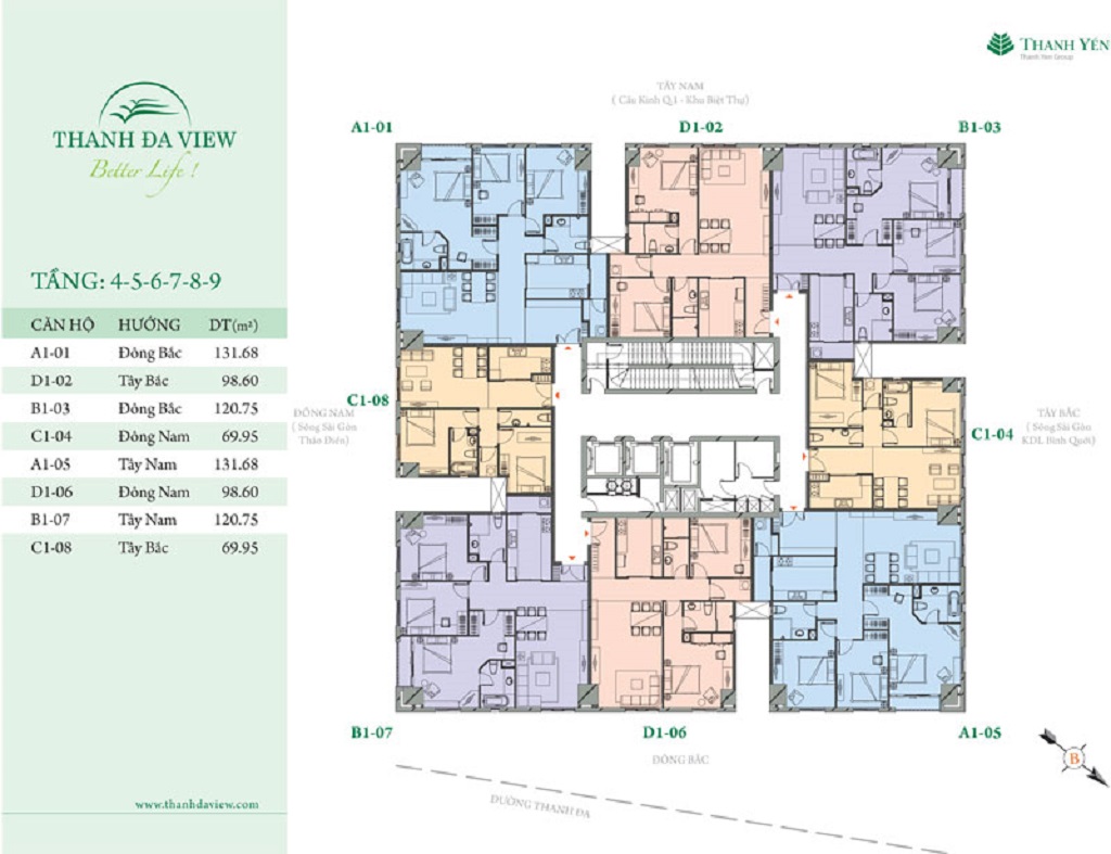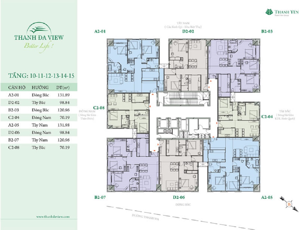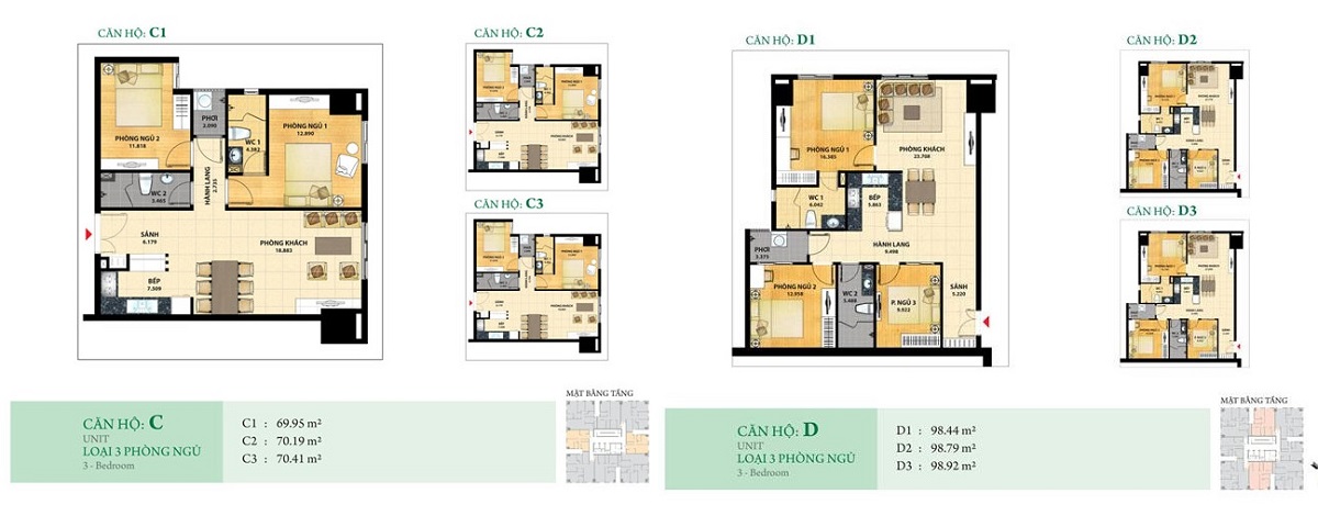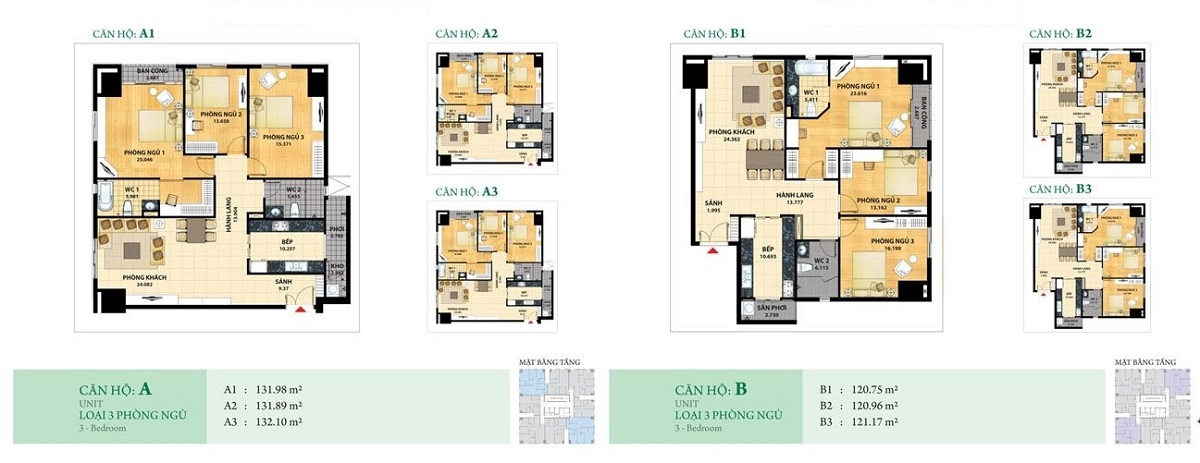 Khách hàng tới tìm hiểu dự án sẽ có 4 sự lựa chọn căn hộ bao gồm diện tích từ 70m2 – 99m2 – 120m2 – 131m2 với bố trí căn hộ có từ 2 – 3PN hiện đại, mỗi căn có 2 WC.