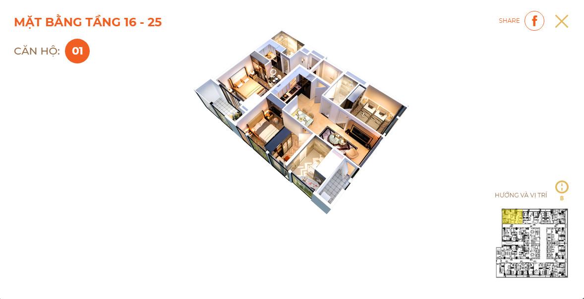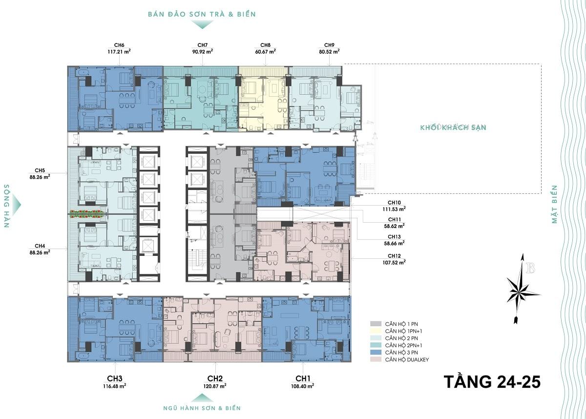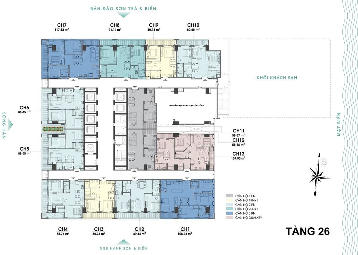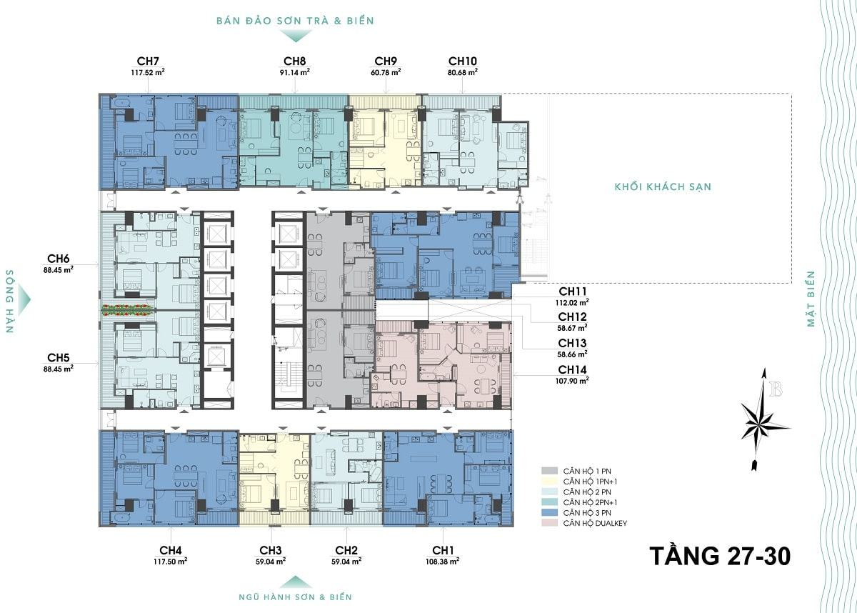 Diện tích trên đều là diện tích thông thủy, các không gian trong căn hộ đều rộng, 100% căn hộ có ban công rộng rãi, view nhìn trực diện biển, trung tâm thành phố, vịnh Đà Nẵng và bán đảo Sơn Trà.