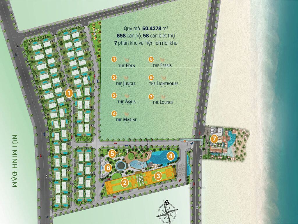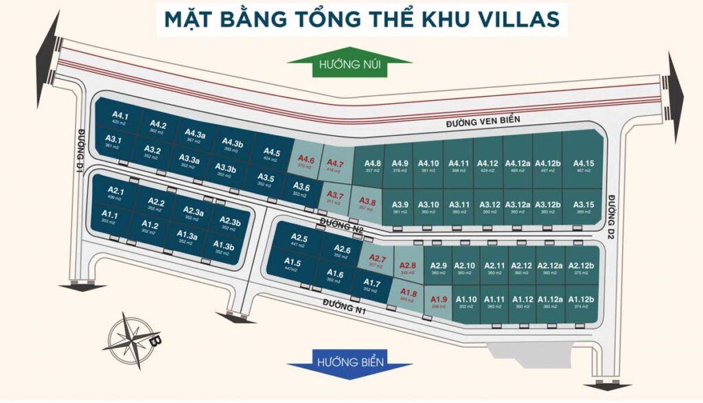 • Tổng số: 58 căn (3 Phòng ngủ), gồm 2 dãy Villas phía trước gần biển & 2 dãy Villas phía sau gần núi, hướng biển.