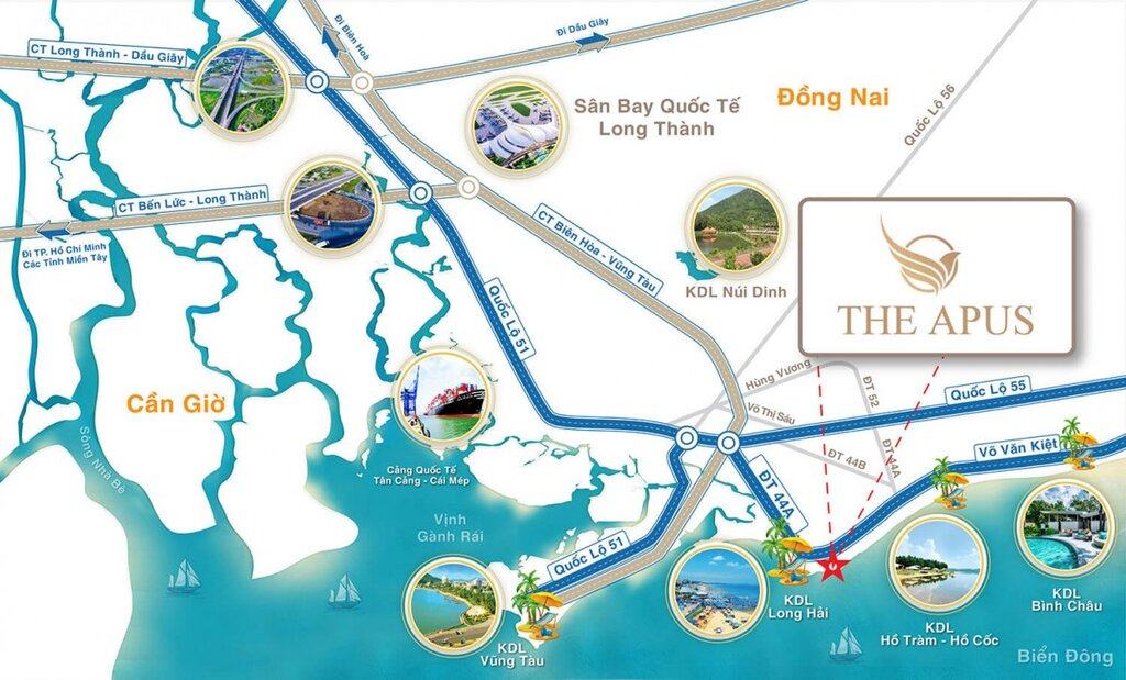 Với địa thế vàng nằm riêng biệt và có bờ biển dài, gần nhiều sân Golf như Bluffs, Paradise cũng như sân bay như sân bay Quốc tế Long Thành, sân bay Vũng Tàu, Sân bay Charter, suối nước nóng Bình Châu, dự án The Apus hứa hẹn là điểm lưu trú du lịch hấp dẫn cho các gia đình, đồng thời là một trong những địa điểm tổ chức hội nghị, hội thảo hàng đầu cho các cơ quan, tổ chức,…