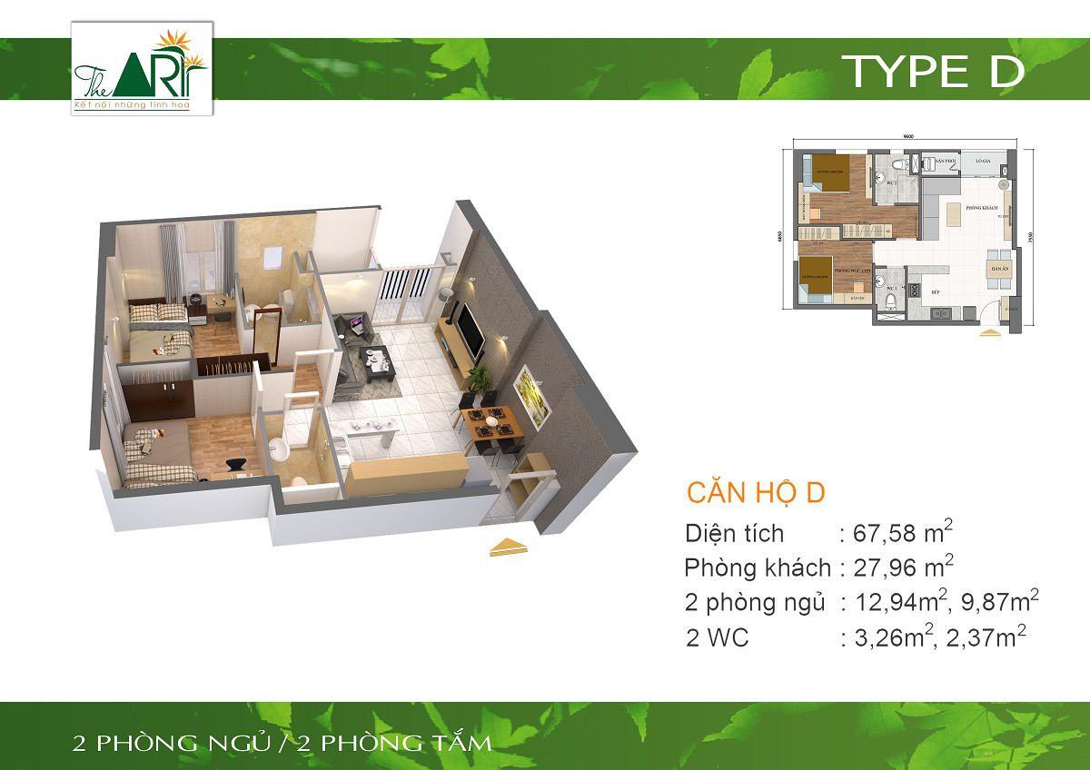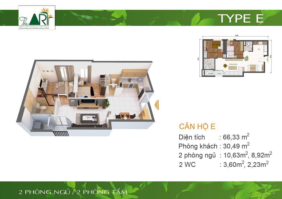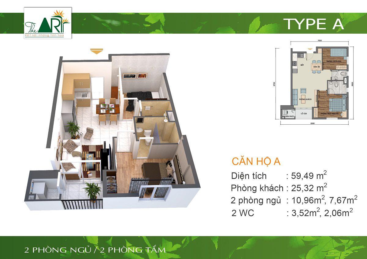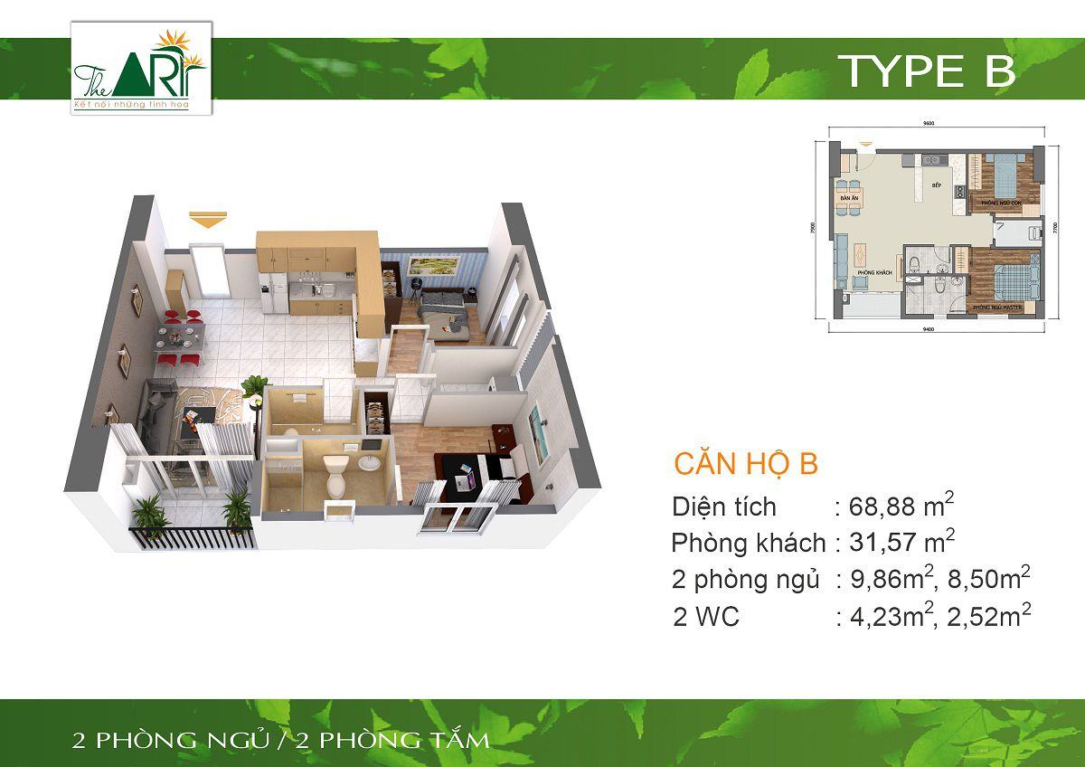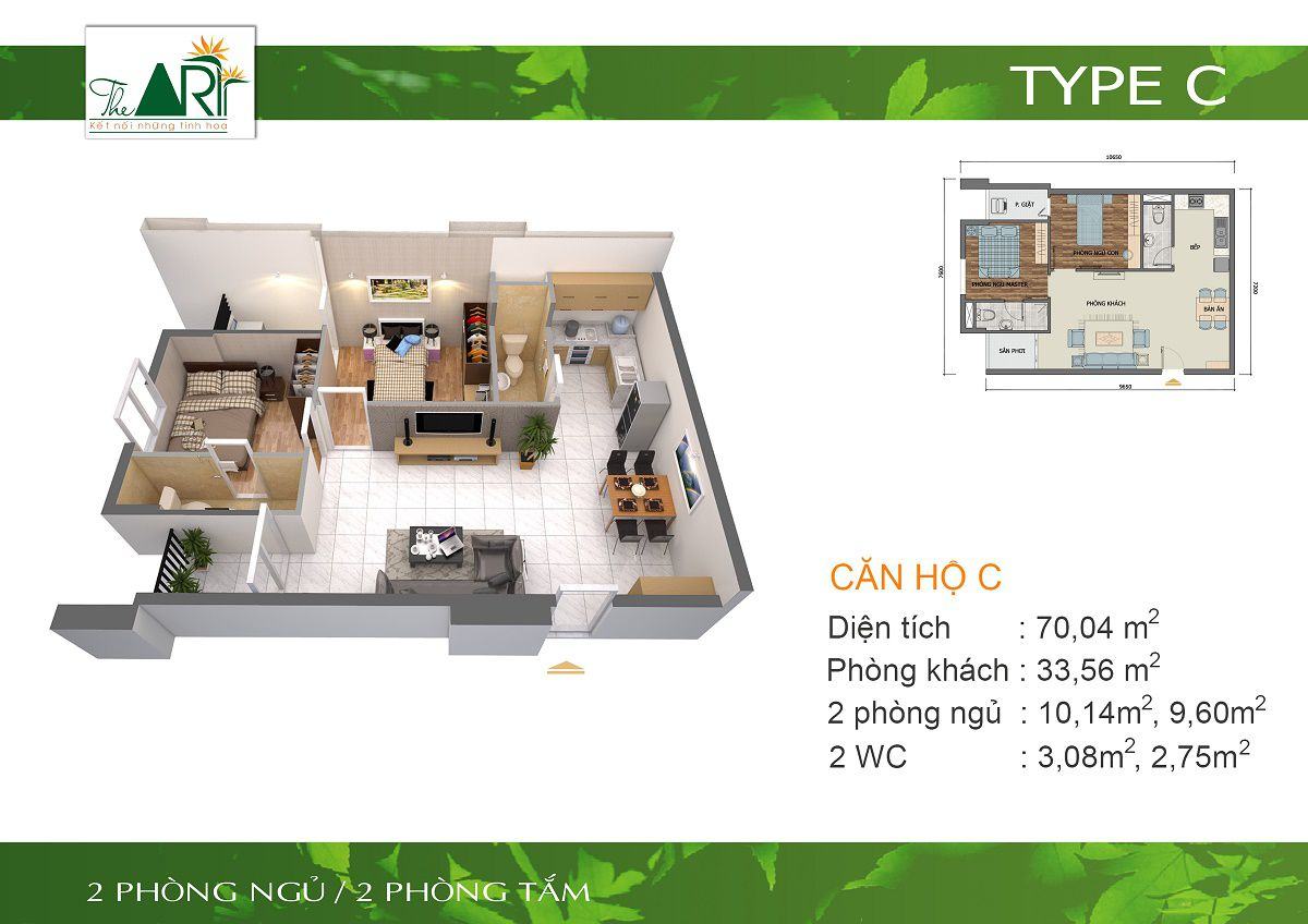 Các căn hộ có thiết kế tiện nghi, đơn giản hiện đại, phù hợp với giới trẻ năng động, mạnh mẽ. Căn hộ The Art có tổng cộng 1.711 căn hộ, gồm 01 hầm 22.000 m2, 10 tháp căn hộ cao 18 tầng và 1 tháp thương mại cao 5 tầng. Loại căn hộ 2 phòng ngủ có diện tích từ 59 m2 – 70 m2; loại 3 phòng ngủ và penthouse thông tầng có diện tích từ 128 – 144 m2. Tất cả đều có thiết kế sang trọng, hiện đại và tiện nghi. Dưới đây là một sô mẫu căn hộ có thiết kế 2 PN.
