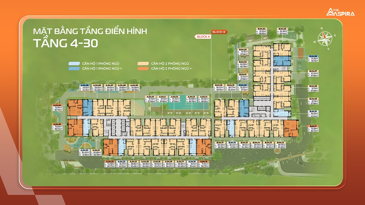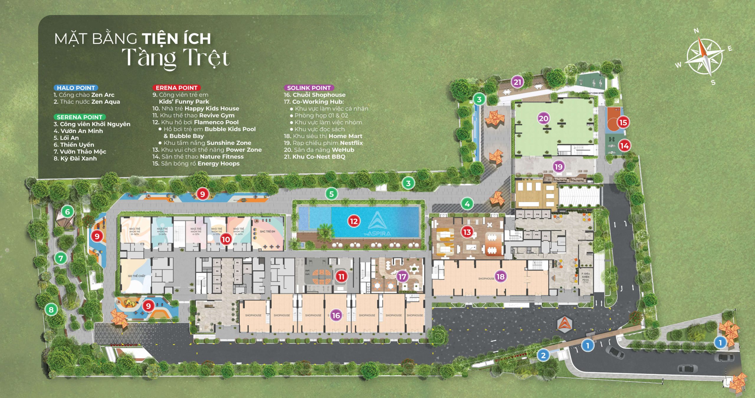 Mặt bằng The Aspira được quy hoạch cực kỳ thông minh với mật độ xây dựng khối tháp chỉ chiếm khoảng 46,5%, phần lớn diện tích được nhường lại cho cảnh quan và mặt nước.