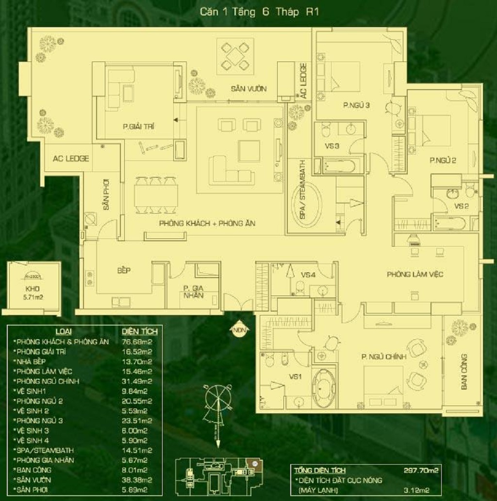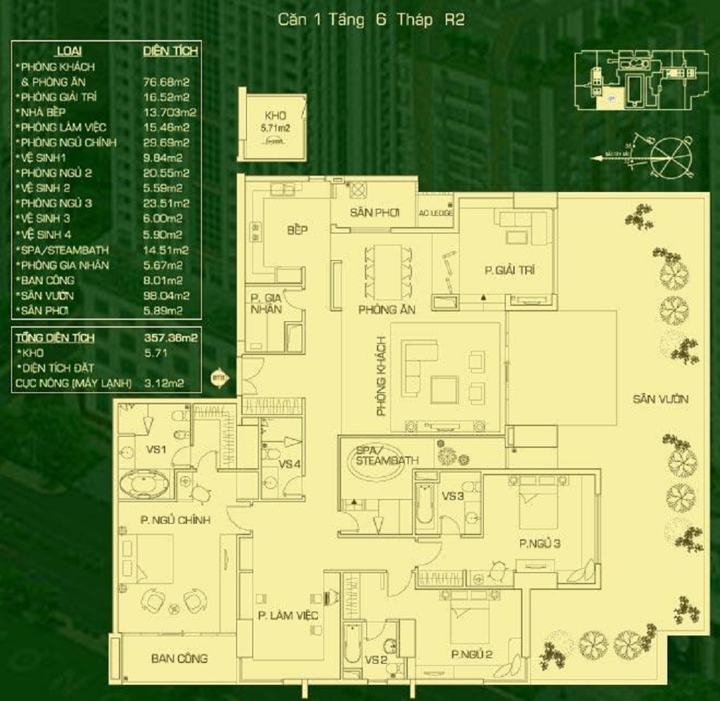 + Căn hộ sân vườn có 3PN + 1 phòng gia nhân: 288 m2 – 517 m2