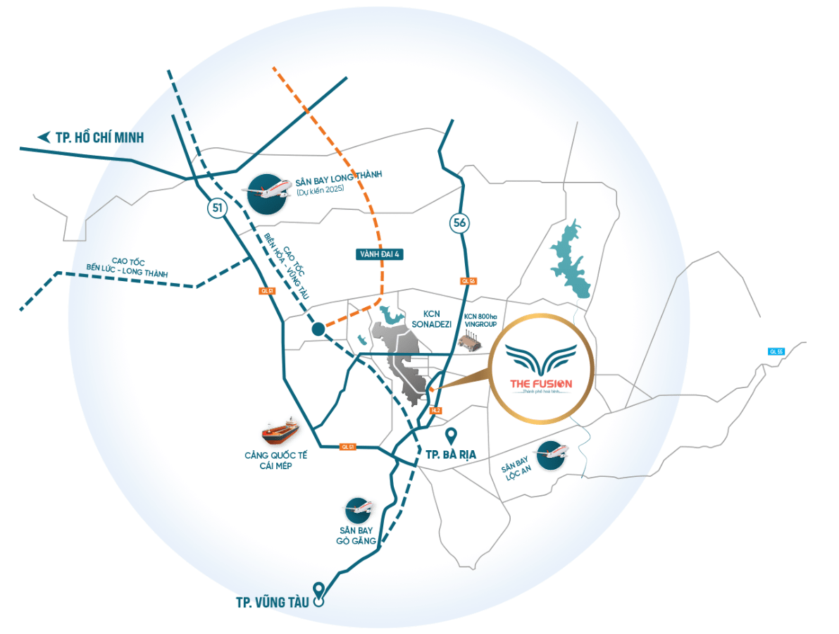 Nhờ sở hữu vị thế chiến lược: ngay lòng chảo phát triển của cụm Khu công nghiệp Sonadezi Châu Đức quy tụ hơn 80.000 chuyên gia và công nhân, cư dân The Fusion dễ dàng lưu thông đến các khu vực quan trọng lân cận.