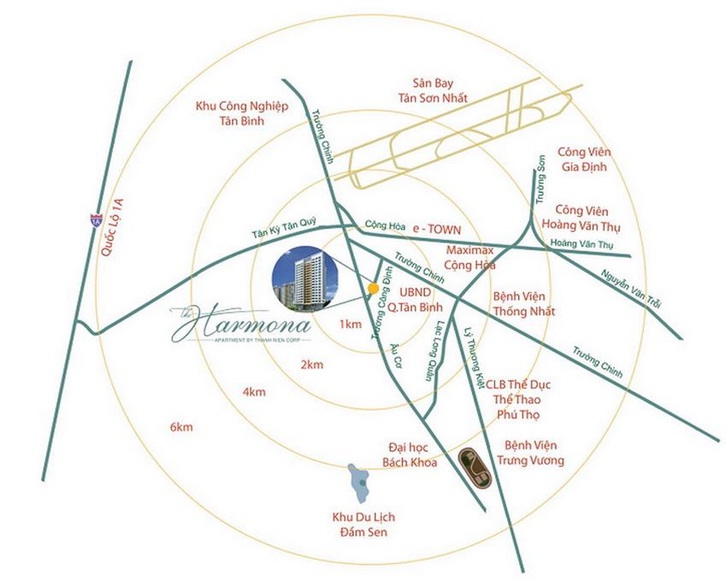 Trong vòng 15 phút, cư dân tại căn hộ The Harmona có thể dễ dàng tiếp cận với các siêu thị như Big C, Lottle, Maximart, Aeon Mall, Co.op Mart; Hệ thống trường học từ cấp 1, 2, 3, các trung tâm giáo dục; Khu Etow trên đường cộng hòa; Các bệnh viện lớn như bệnh viện Thống Nhất, bệnh viện Tân Phú… ; Sân bay Tân Sơn Nhất; Rạp chiếu phim Galaxy.