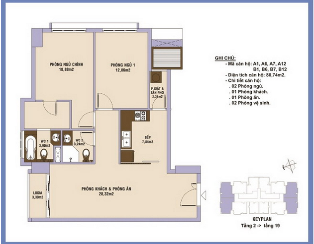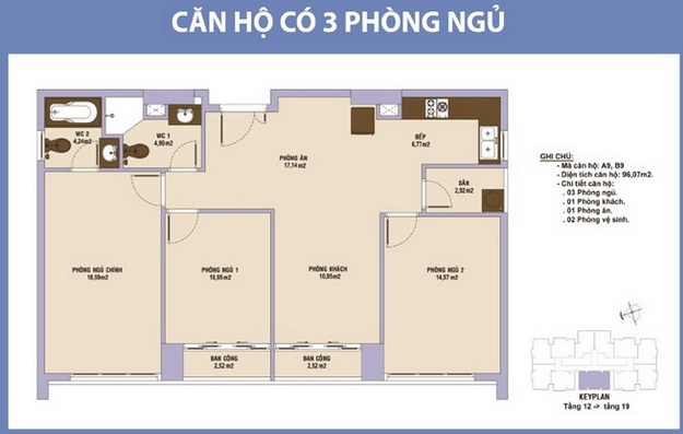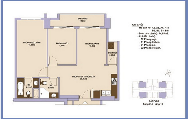 • Diện tích các căn hộ: 72m2 – 74.65m2 – 80,74m2 – 96.07m2 với 1,2,3 phòng ngủ