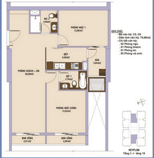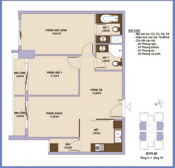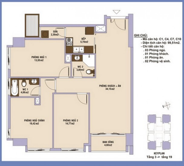 • Block C: có 165 căn hộ, bao gồm loại căn hộ 2, 3 phòng ngủ và căn hộ penthouse