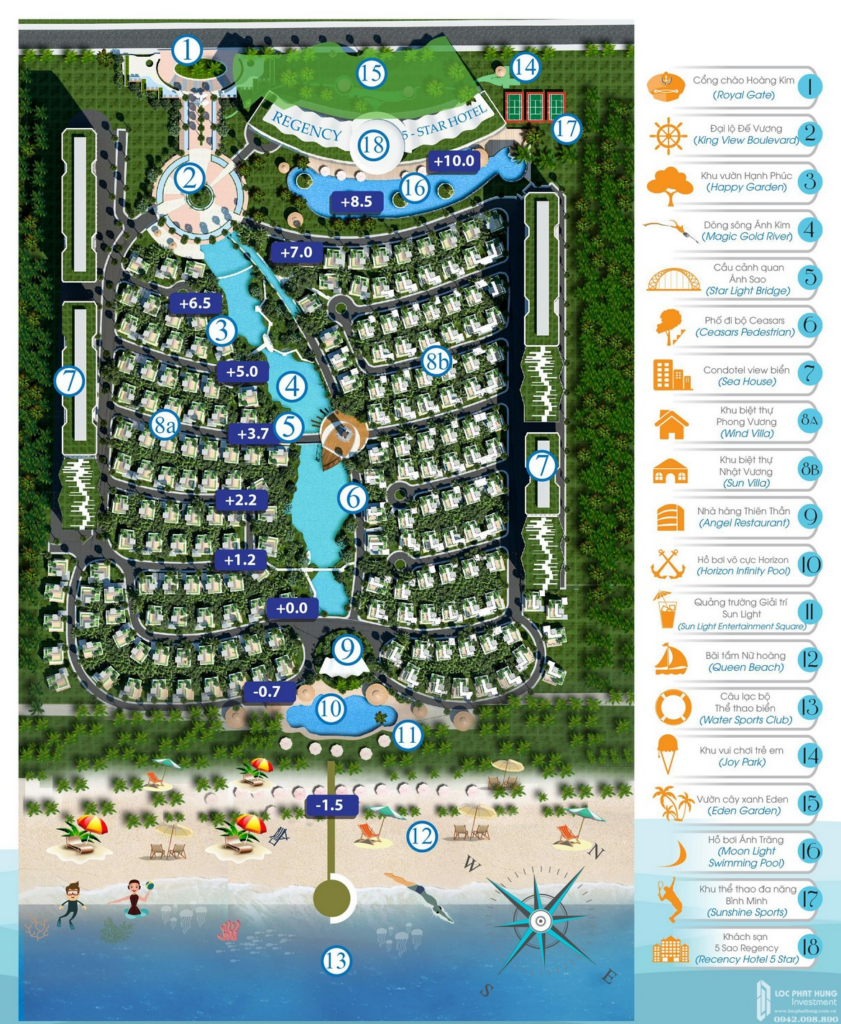 Mặt bằng phân lô biệt thự được phân thành hai khu A và B. Thiết kế theo ý tưởng ruộng bậc thang với cao độ mỗi cấp từ 1 đến 1,2m và được xây dựng lệch nhau, tất cả các biệt thự đều view biển và bàn giao biệt thự hoàn thiện ngoài thô phần trong