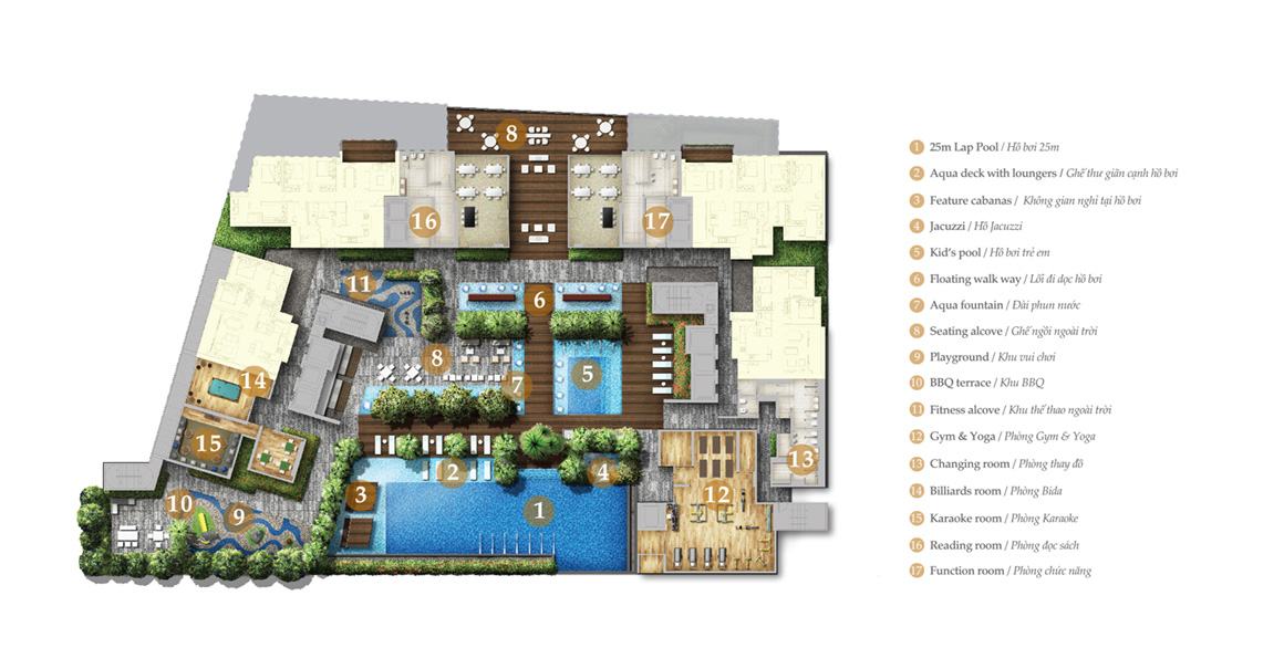 • Hồ bơi Jacuzzi | Đài phun nước | Lối đi dọc hồ bơi | Khu thể thao ngoài trời | Khu BBQ | Khu chức năng | Phòng sinh hoạt … |
