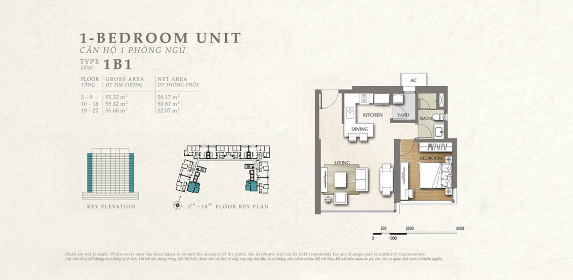 Căn hộ 1PN có diện tích trung bình: 55 – 57 m2