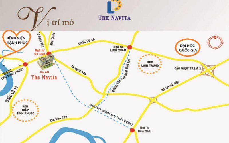 Vị trí The Navita ở tại KP4, gần ngã tư Gò Dưa thuộc P. Tam Bình, Quận Thủ Đức. So với những dự án tại Thủ Đức thì The Navita có phần “thua thiệt” hơn khi không nằm cạnh nhiều tuyến đường cao tốc lớn tuy nhiên điều đó không có nghĩa là chúng ở nơi “hẻo lánh”. Theo đó, việc nằm cạnh đường quốc lộ và vành đai trên cao cũng đã mang đến những lợi thế không nhỏ trong việc nâng cao giá trị kinh tế của The Navita trong tương lai.