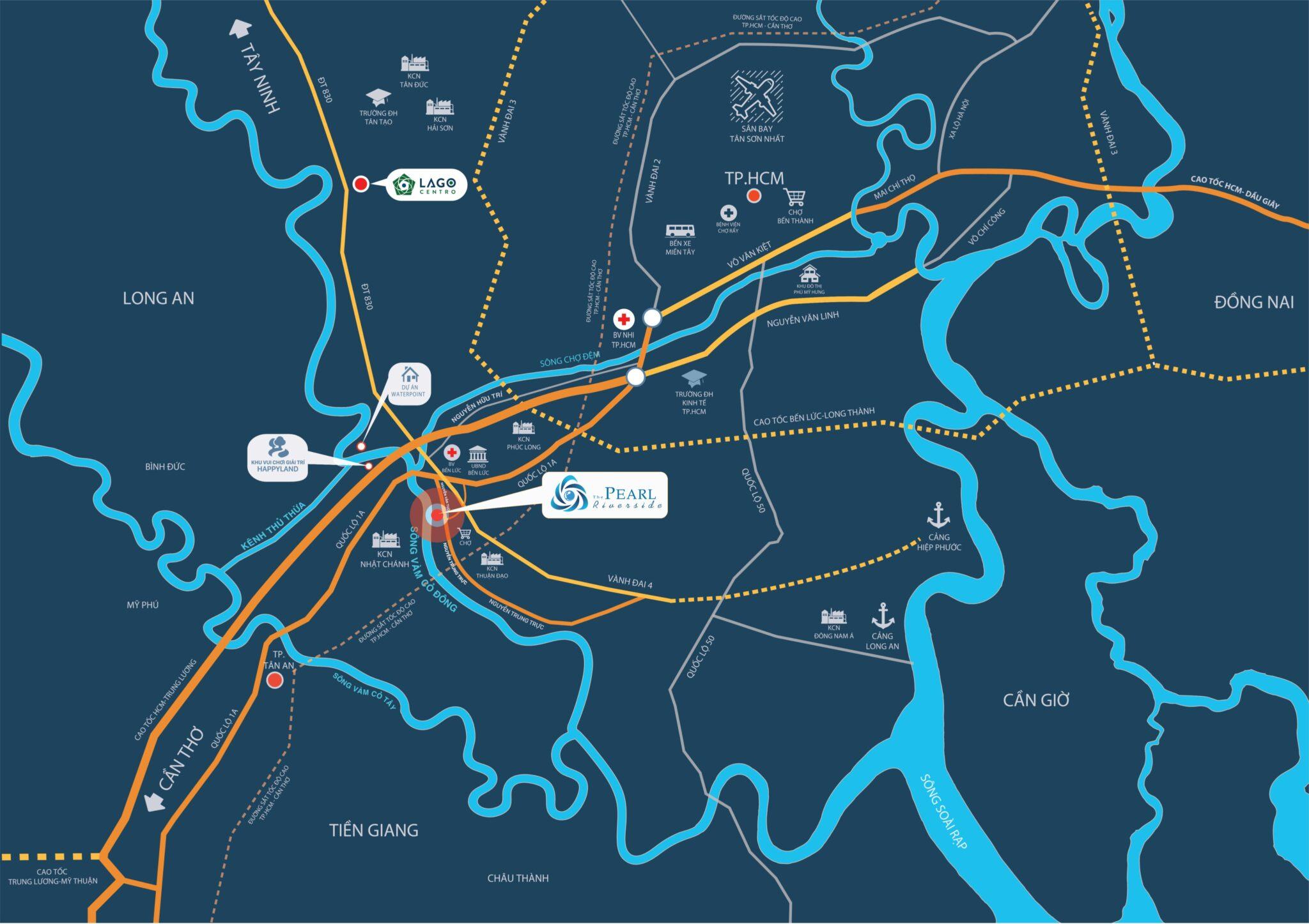 Từ dự án The Pearl Riverside Bến Lức chỉ mất khoảng 20 phút di chuyển đến Aeon Mall Bình Tân; Bệnh viện nhi đồng 3; khoảng 40 phút về Sân bay Tân Sơn Nhất qua cao tốc TP.HCM – Trung Lương.
