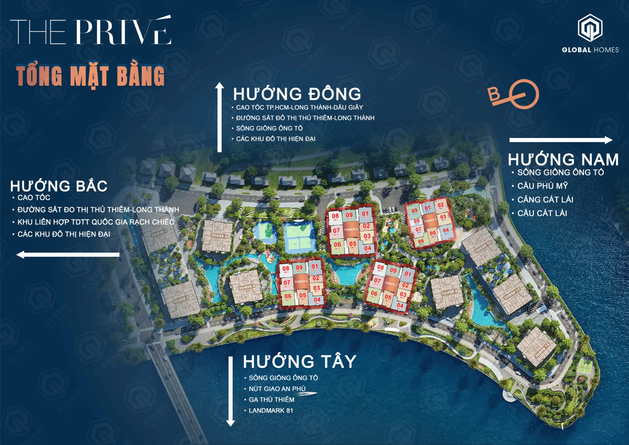 The Privé bao gồm 12 block nhà cao 33 – 35 tầng, được bố trí dọc theo đường bờ sông uốn lượn. Cách bố trí thông minh này đảm bảo tối đa các căn hộ đều sở hữu tầm nhìn panorama tuyệt đẹp: hướng ra sông Giồng Ông Tố, hướng về trung tâm Quận 1 phồn hoa hoặc nhìn xuống chuỗi hồ bơi resort nội khu.