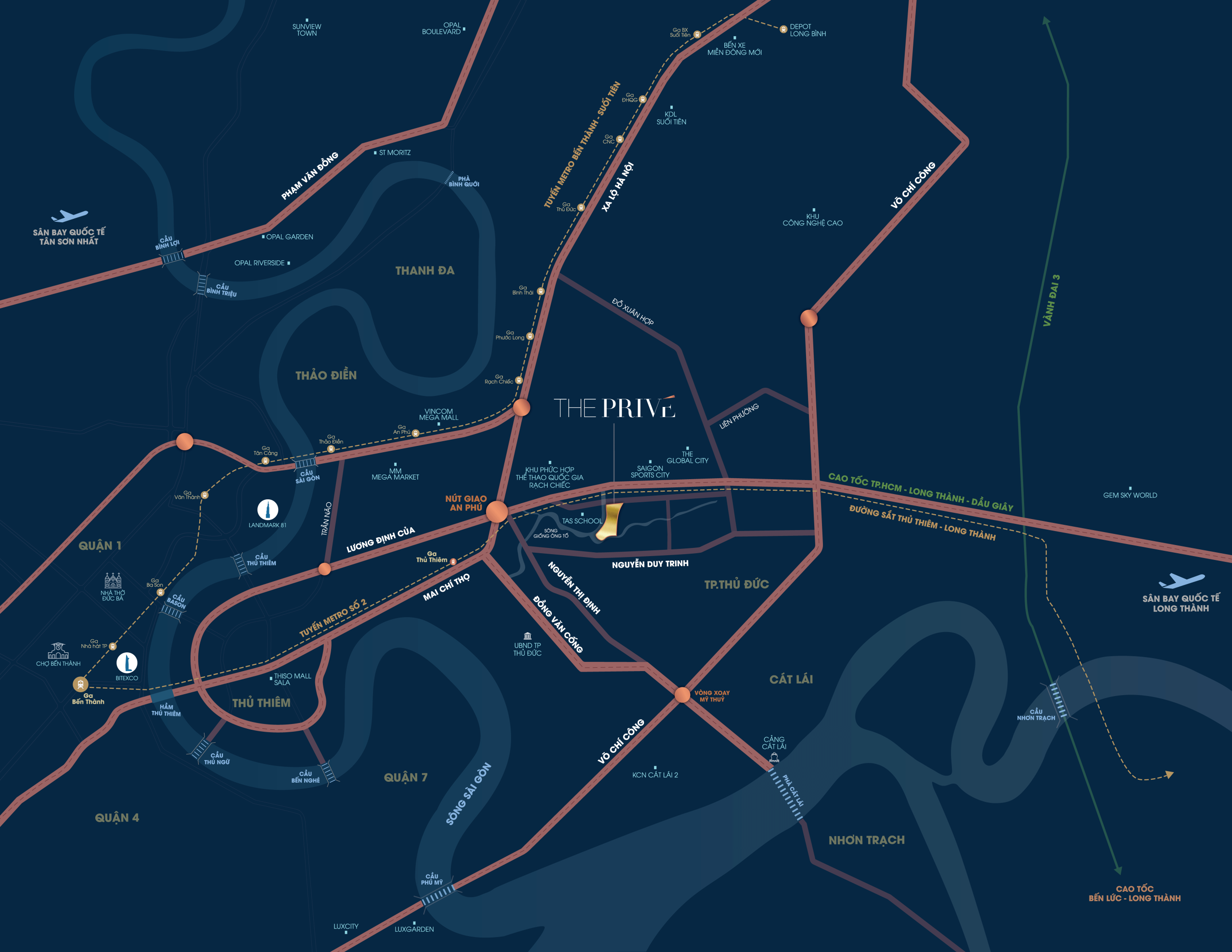 Trong đầu tư bất động sản, vị trí luôn là yếu tố kiên quyết định đoạt giá trị tài sản. Vị trí The Privé được các chuyên gia đánh giá là sở hữu tọa độ “vàng” khi nằm ngay trung tâm phường An Phú, TP. Thủ Đức, với mặt tiền đường Song Hành cao tốc TP.HCM – Long Thành – Dầu Giây.