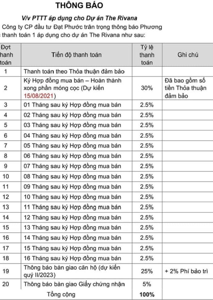 | 4 | Thông báo bàn giao căn hộ (Dự kiến quý II/2023) | 25% | +2% phí bảo trì |