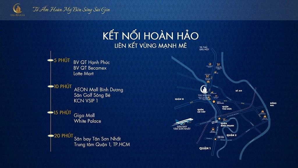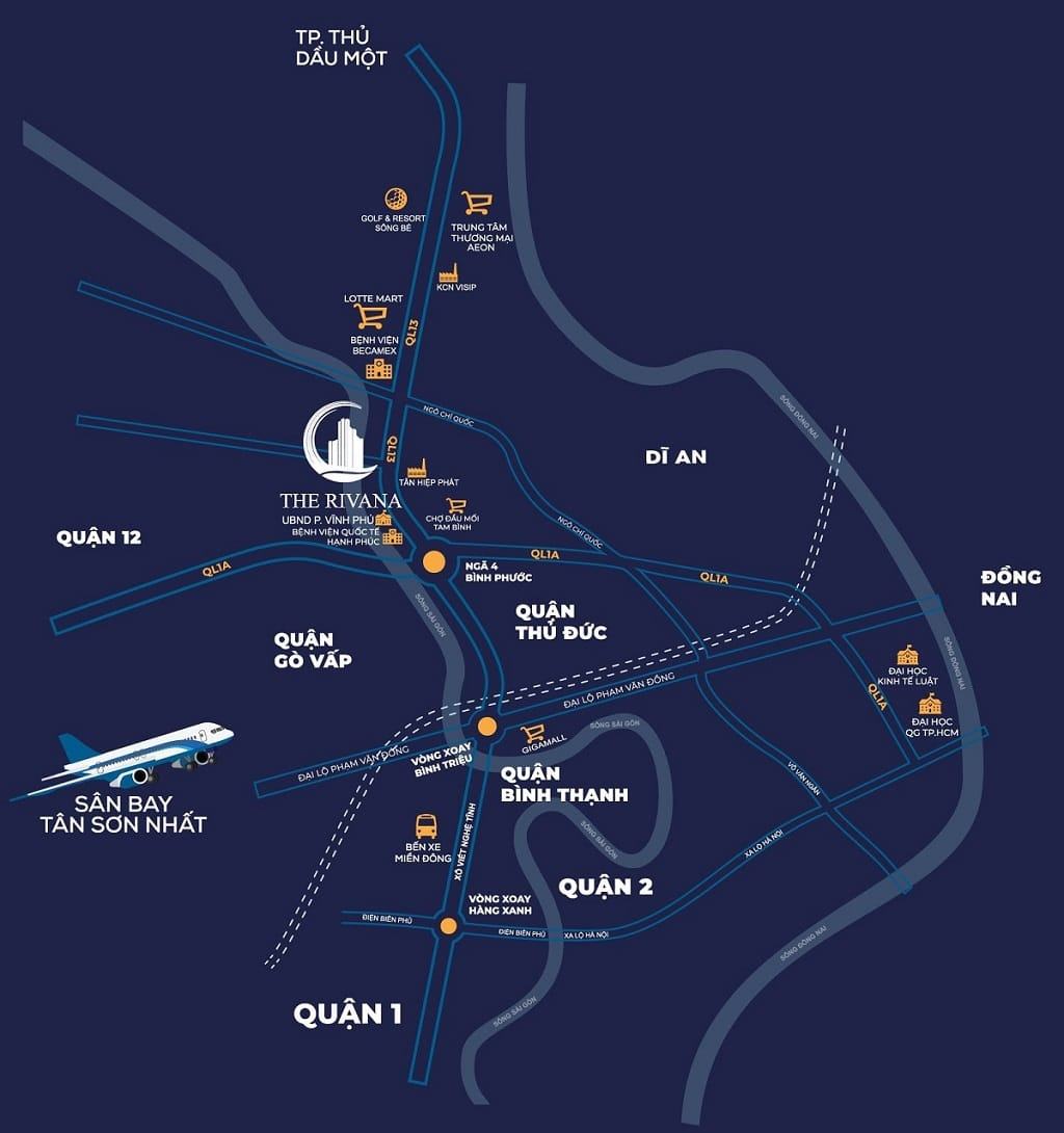 The Rivana là phân khúc cao cấp đầu tiên ở Đại Lộ Bình Dương vừa sở hữu vị trí mặt tiền QL13 lẫn view sông Sài Gòn tuyệt đẹp, chỉ cách TPHCM chưa đầy 3 phút để đến ngã tư Bình Phước – Thủ Đức, sẽ giúp khách hàng trải nghiệm phong cách “newlife style” đầy hiện đại và tiện nghi, sầm uất bậc nhất khu vực.