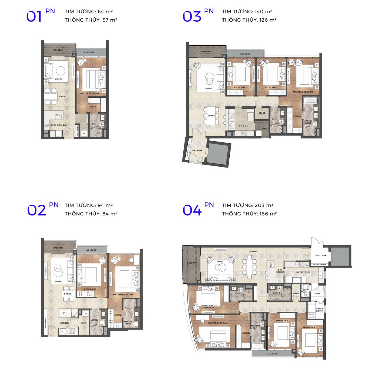 Diện tích căn hộ: Căn hộ 1PN ~57m2; 2PN ~77-82m2; 3PN ~119-125m2 và 4PN ~155m2