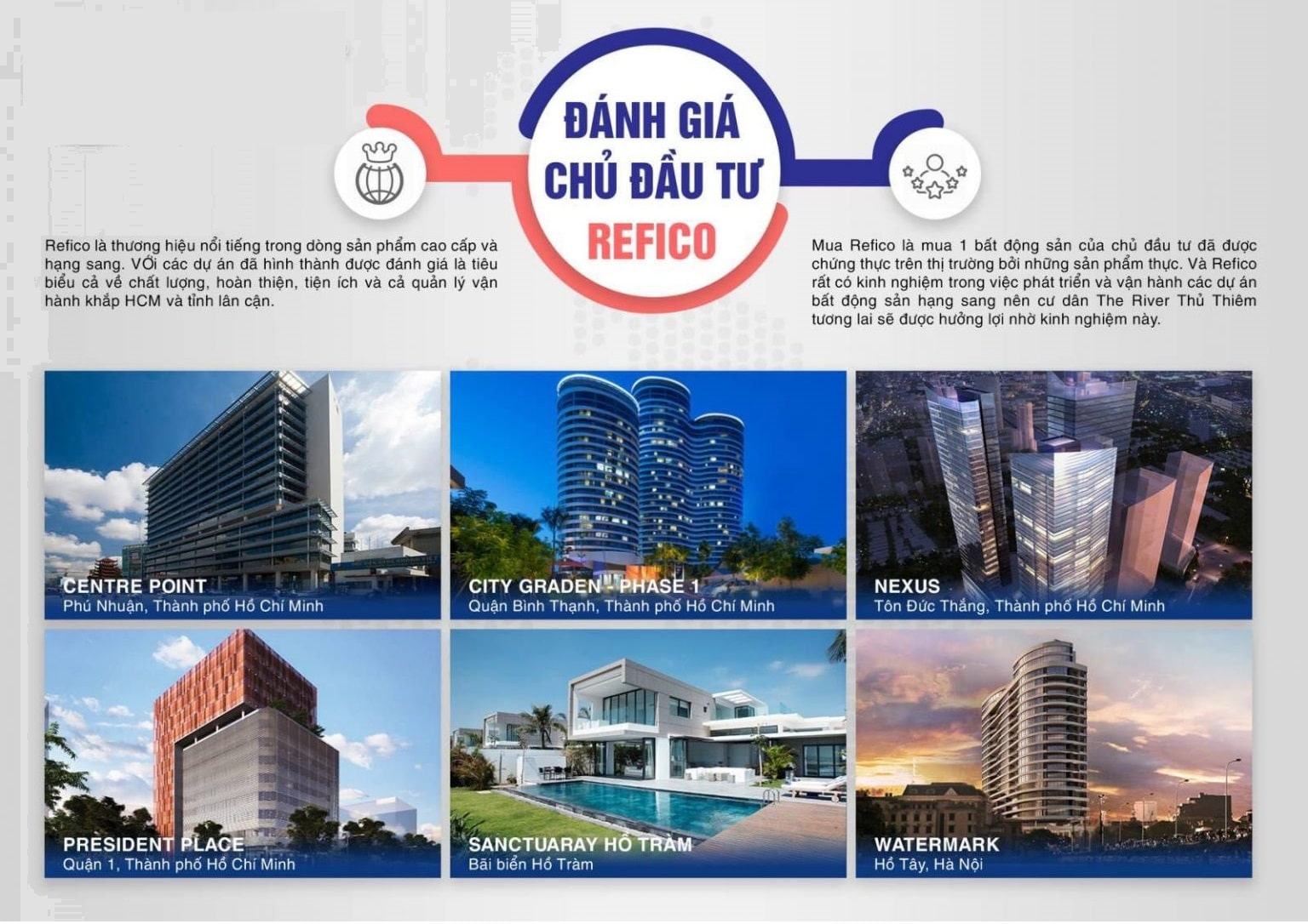 Refico là thương hiệu nổi tiếng trong dòng sản phẩm cao cấp và hạng sang. Với các dự án đã hình thành được đánh giá là tiêu biểu cả về chất lượng, hoàn thiện, tiện ích và cả quản lý vận hành khắp HCM và tỉnh lân cận.