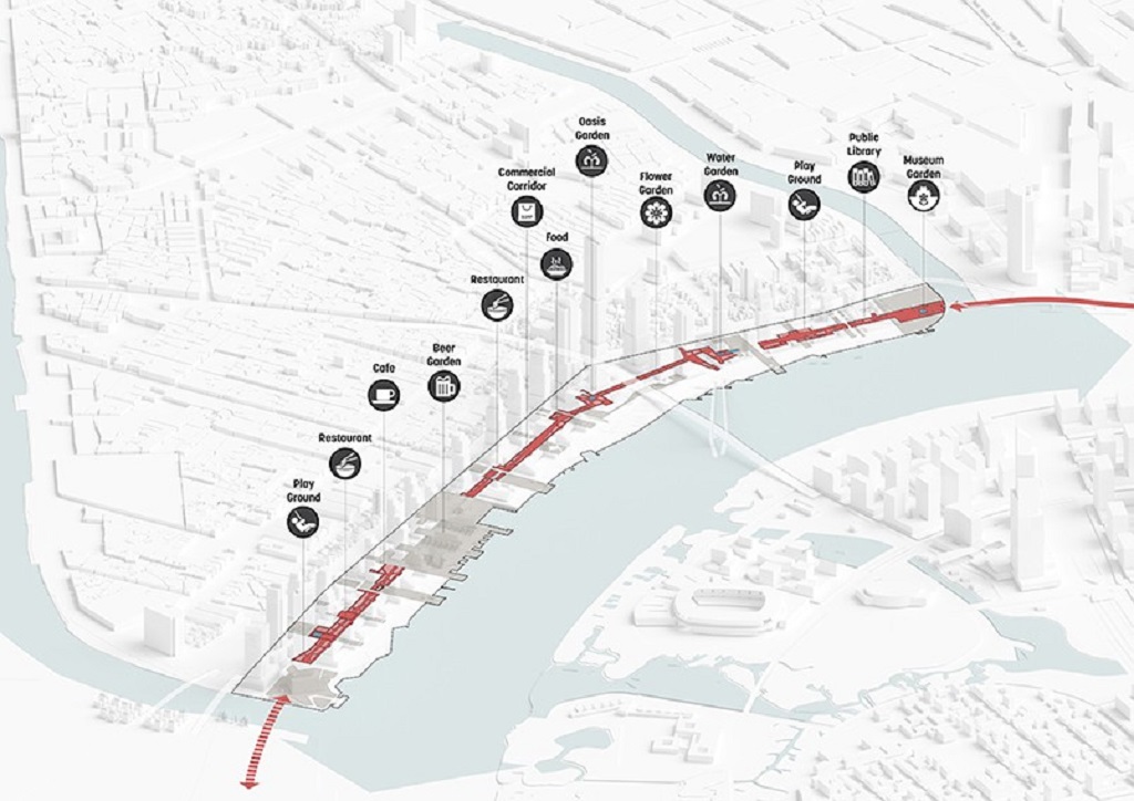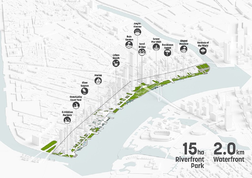 Công viên ven sông với các khu chức năng, lần lượt từ phải qua :Vườn Thế Giới, bãi cỏ dốc thoải, rừng cây lá rụng, cầu tàu đi bộ, cầu đường bộ, nhà hát ngoài trời, vườn mưa, bãi biển đô thị, bến thuyền du lịch, đầm phá sông, sân sinh hoạt cộng đồng, khu triển lãm ngoài trời.